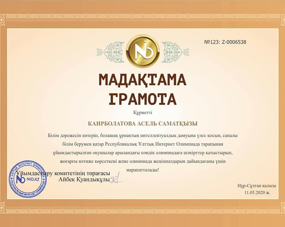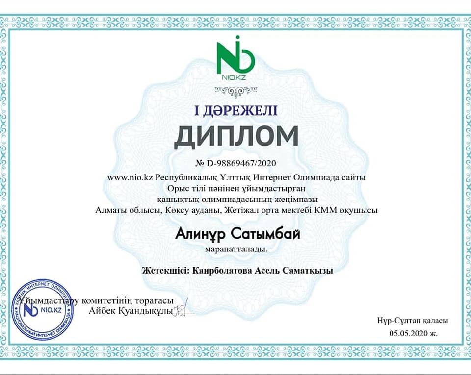 Respýblıkalyq Ulttyq Internet Olımpıada ortalyǵy orys tіlі men ádebıetі pánіnen uıymdastyrǵan qashyqtyq olımpıadaǵa 5-8synyp oqýshylary qatysyp, júldelі I oryndarǵa ıe boldy.ShYN JÚREKTEN QUTTYQTAIMYZ!!!🥇🎉🎉🎉Pán muǵalіmі: Kaırbolatova A.S.