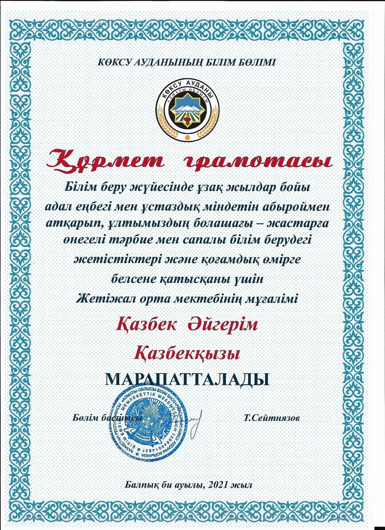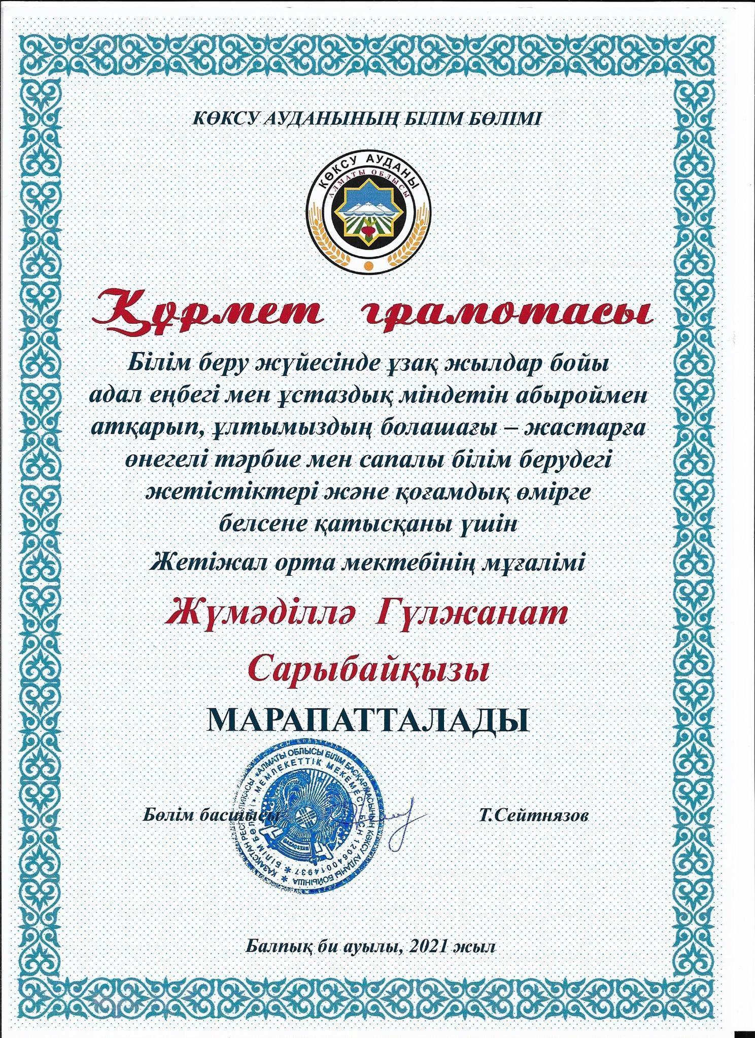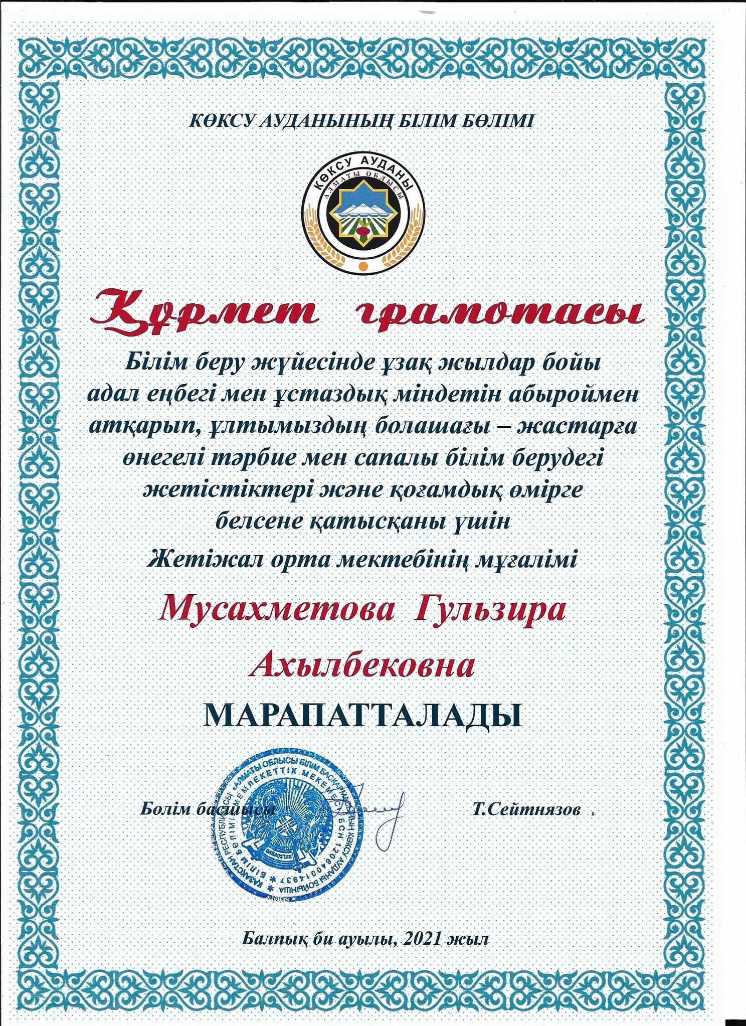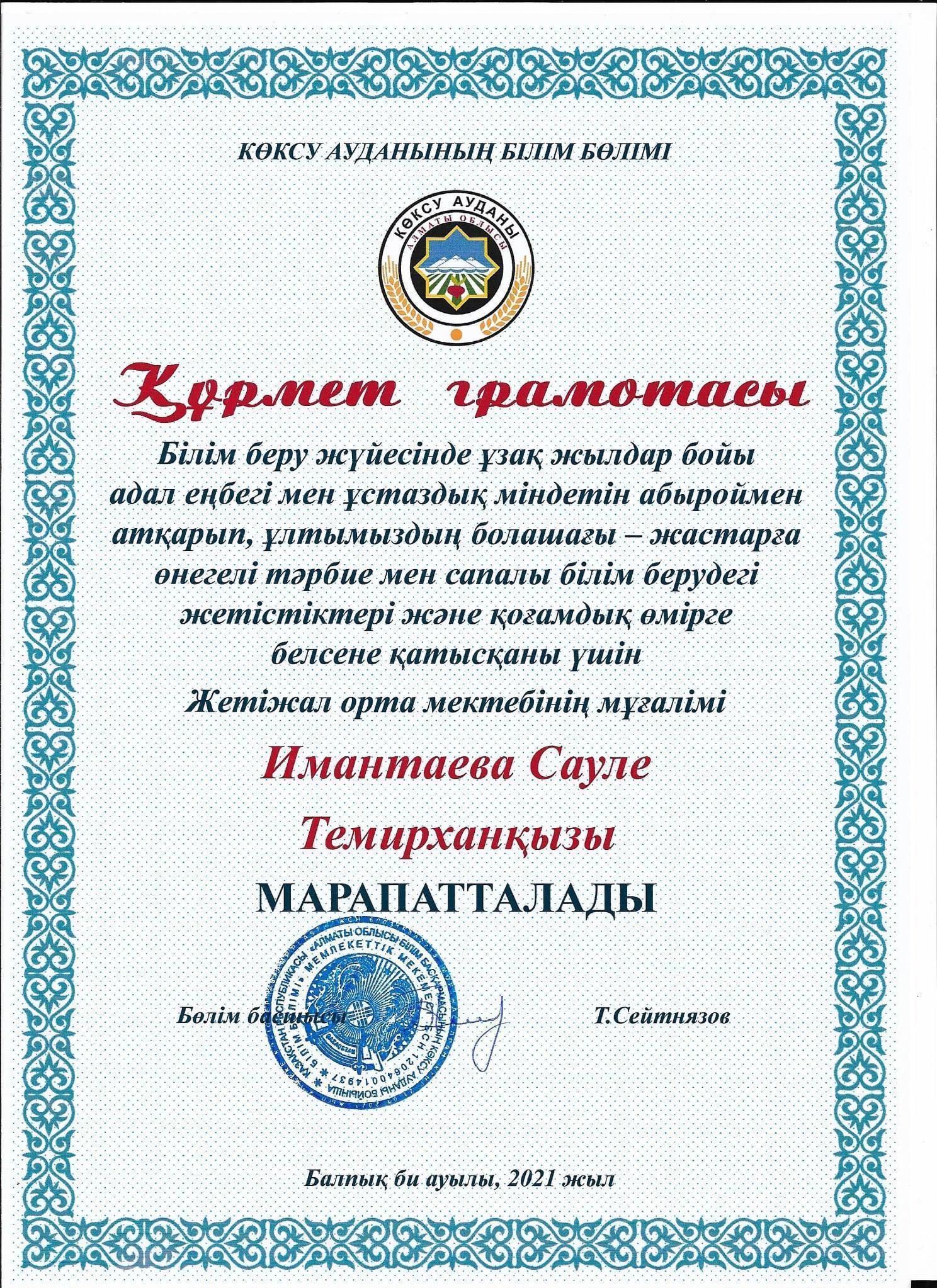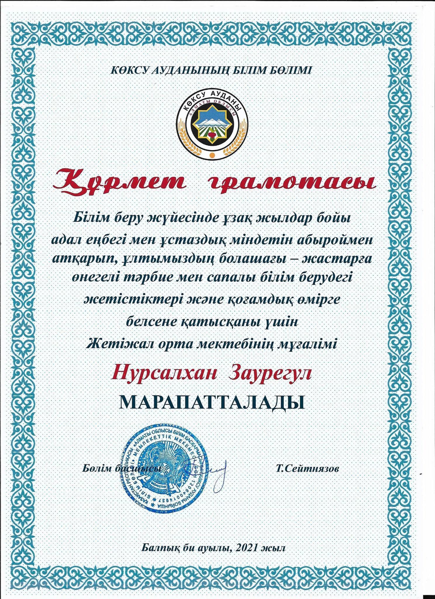 Білім беру жүйесінде ұзақ жылдар бойы адал еңбегі мен ұстаздық міндетін абыроймен атқарып, ұлтымыздың болашағы - жастарға өнегелі тәрбие мен сапалы білім берудегі жетістіктері және қоғамдық істерге белсене қатысқаны үшін мектебіміздің ұстаздары: Г.А.Мусахметова, З.Нурсалхан, Г.С.Жүмәділлә ,Ә.Қ.Қазбеқызы , С.Т.Имантаева аудандық білім бөлімінің құрмет грамоталарымен марапатталды. Шын жүректен құттықтаймыз!!!