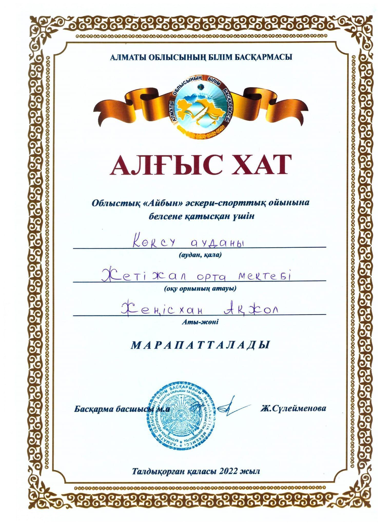 Облыстық "Айбын" әскери-патриоттық ойынына Жетіжал орта мектебінің 11-сынып оқушысы Жеңісхан Ақжол қатысып, жүлделі ІІІ орынға ие болды.Жетекшісі:Фазылов Қ.С. Шын жүректен құттықтаймыз!!!@koksu_bilim