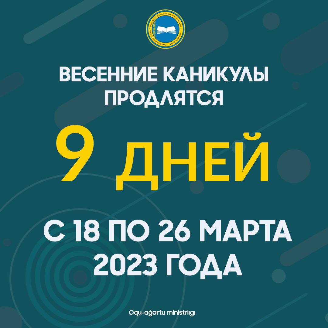16 March 2023 0 1 2 3 4 5 Көктемгі демалыс КҮН САНЫМектеп оқушыларының көктемгі демалысы 2023 жылғы 18-26 наурыз аралығын қоса алғанда 9 күнге созылады.ЦИФРА ДНЯВесенние каникулы для школьников продлятся 9 дней с 18 по 26 Marchа 2023 года включительно.
