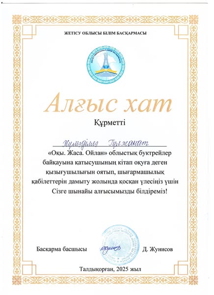 "Оқы. Жаса. Ойлан" облыстық буктрейлер байқауында оқушылардың қабілеттерін дамыту жолында қосқан еңбектері үшін мектебіміздің мұғалімдері басқарма басшысының Алғыс хатымен марапатталды.