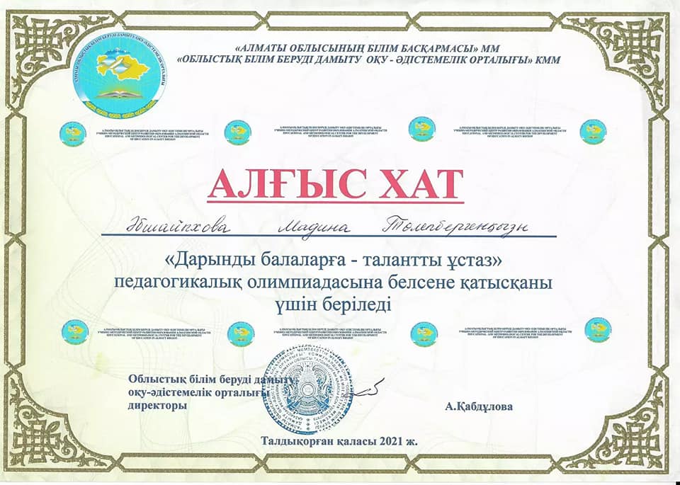 Облыстық "Дарынды балаларға - талантты ұстаз" байқауына қатысқаны үшін Көксу ауданы Жетіжал орта мектебінің математика пәні мұғалімі Әбшайыхова Мадина Төлепбергенқызы алғыс хатпен марапатталды.Құттықтаймыз!!!