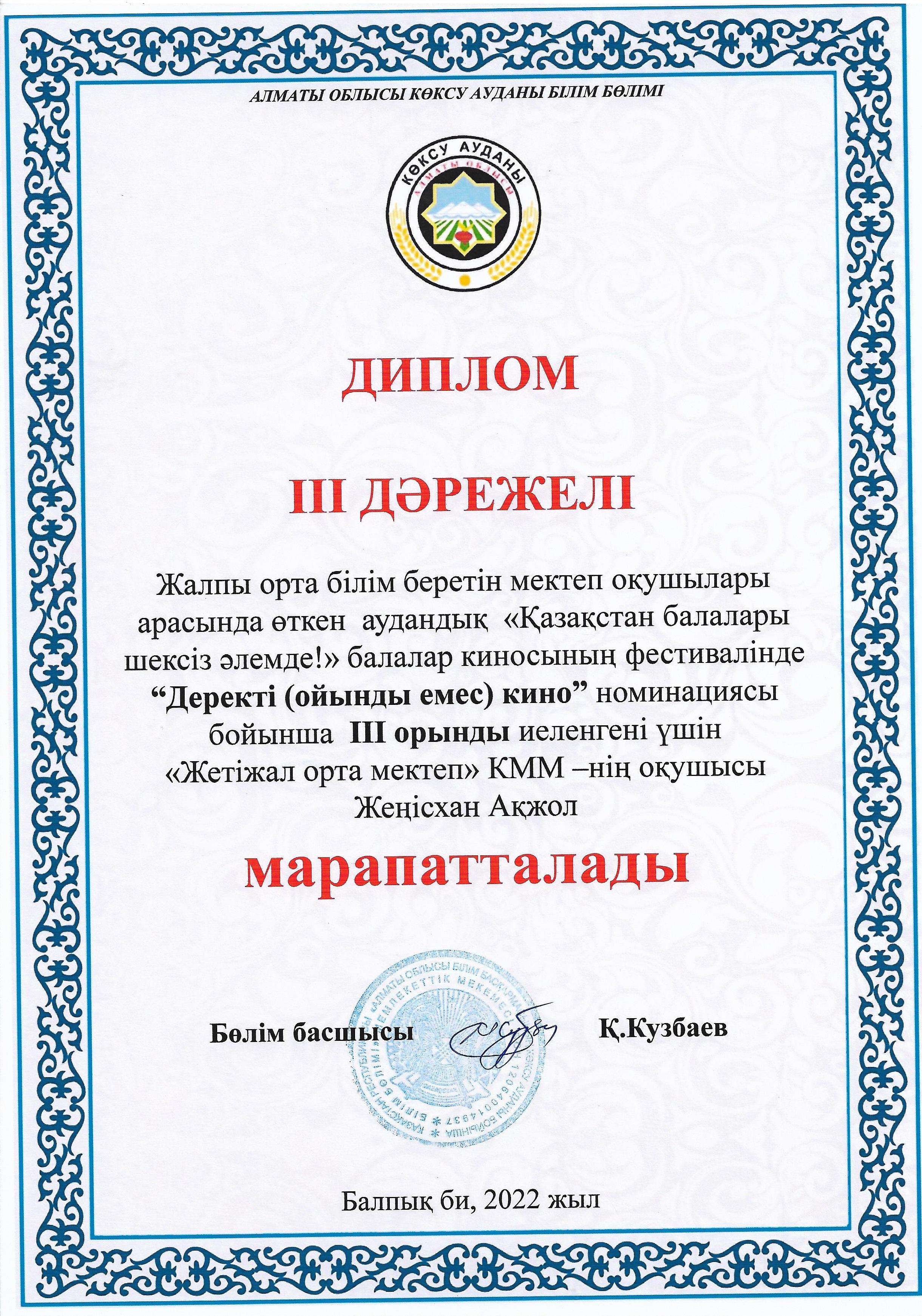 Жалпы орта білім беретін мектеп оқушылары арасында өткен аудандық "Қазақстан балалары шексіз әлемде!" балалар киносының фестиваліне мектебіміздің 11-сынып оқушылары: Хауандагақызы Аружан, Ашкейқызы Айзада, Жеңісхан Ақжол қатысып, жүлделі ІІ және ІІІ орындарға ие болды. Жетекшілік еткен ұстаздар: Жабел Меруерт, Мусабекова Ж.Н. Шын жүректен құттықтаймыз!!!