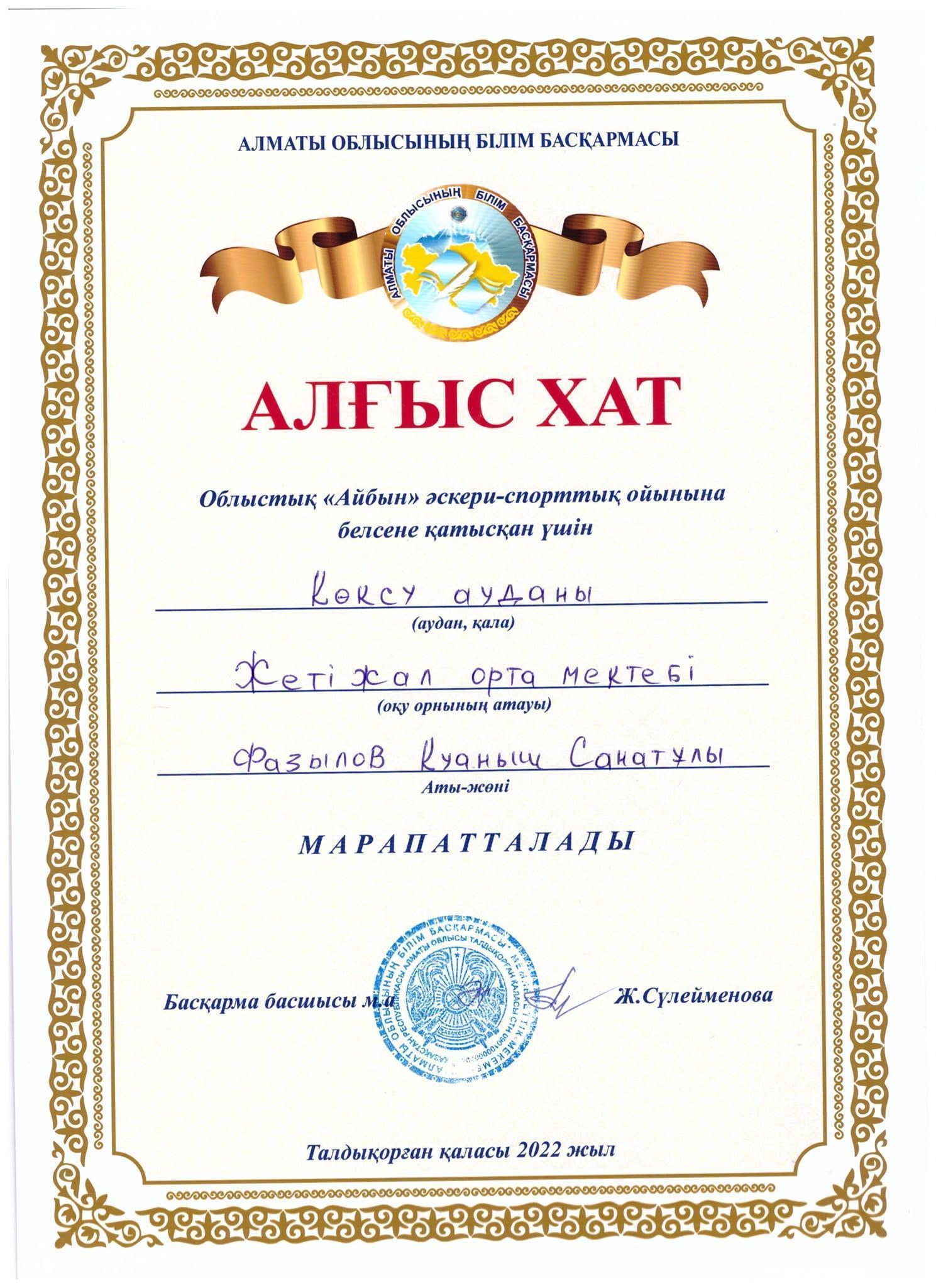 30 May 2022 0 1 2 3 4 5 Облыстық "Айбын" әскери-патриоттық ойыны Облыстық "Айбын" әскери-патриоттық ойынына Жетіжал орта мектебінің 11-сынып оқушысы Жеңісхан Ақжол қатысып, жүлделі ІІІ орынға ие болды.Жетекшісі:Фазылов Қ.С. Шын жүректен құттықтаймыз!!!@koksu_bilim
