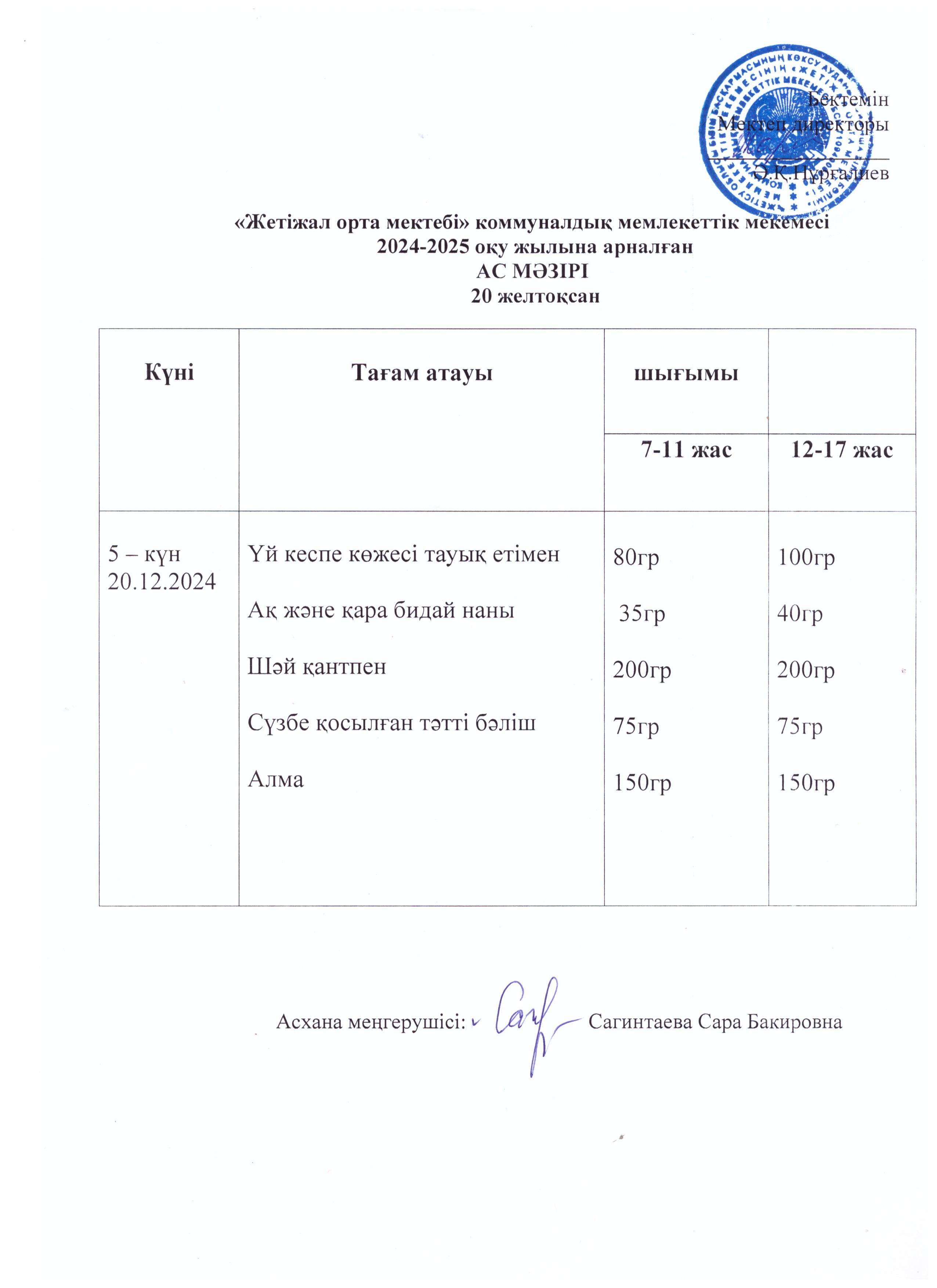 Ас мәзірі 20.12.2024ж » Көксу ауданы Жетіжал орта мектебі