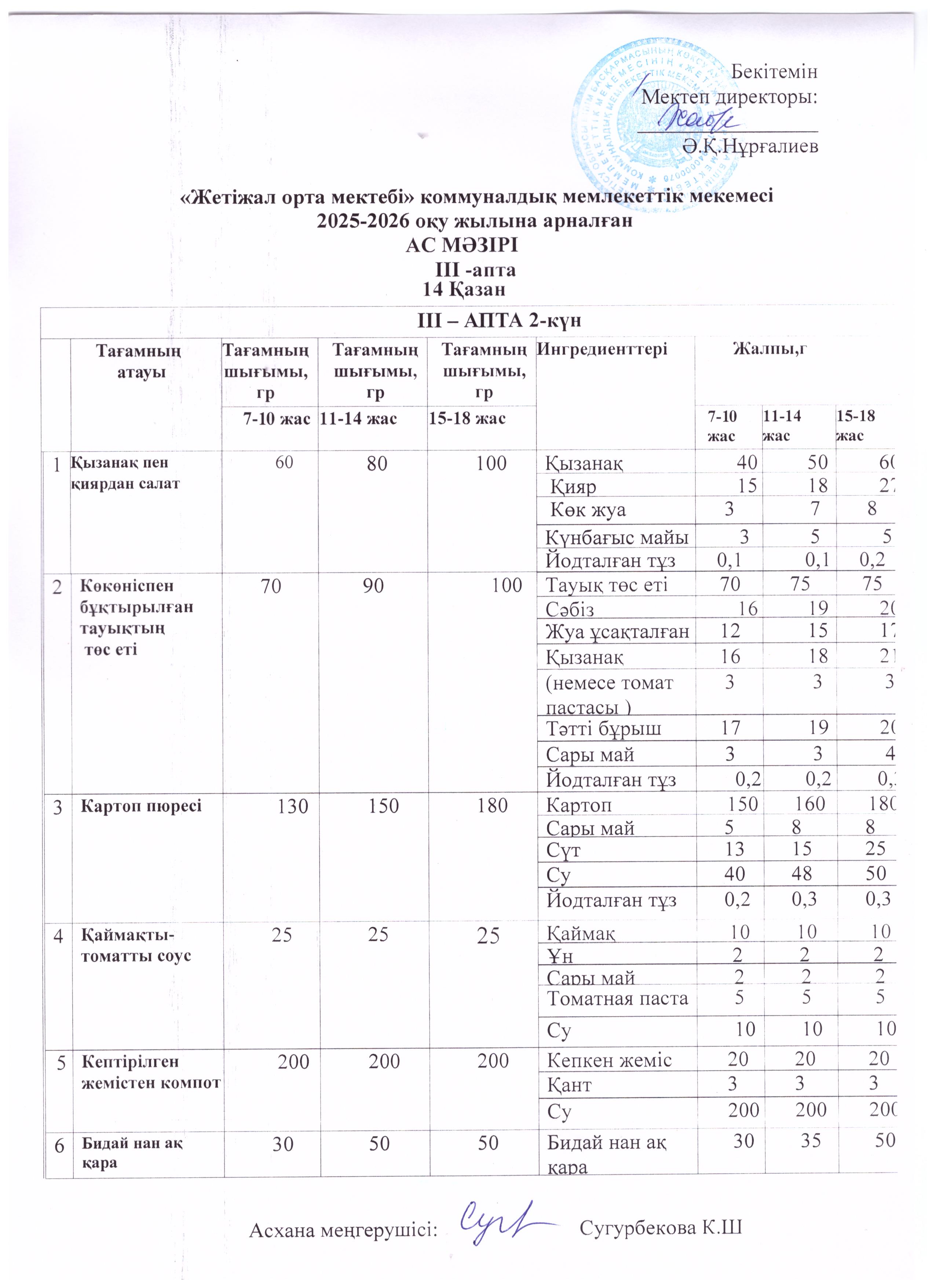 Ас мәзірі 14.10.2025ж » Көксу ауданы Жетіжал орта мектебі
