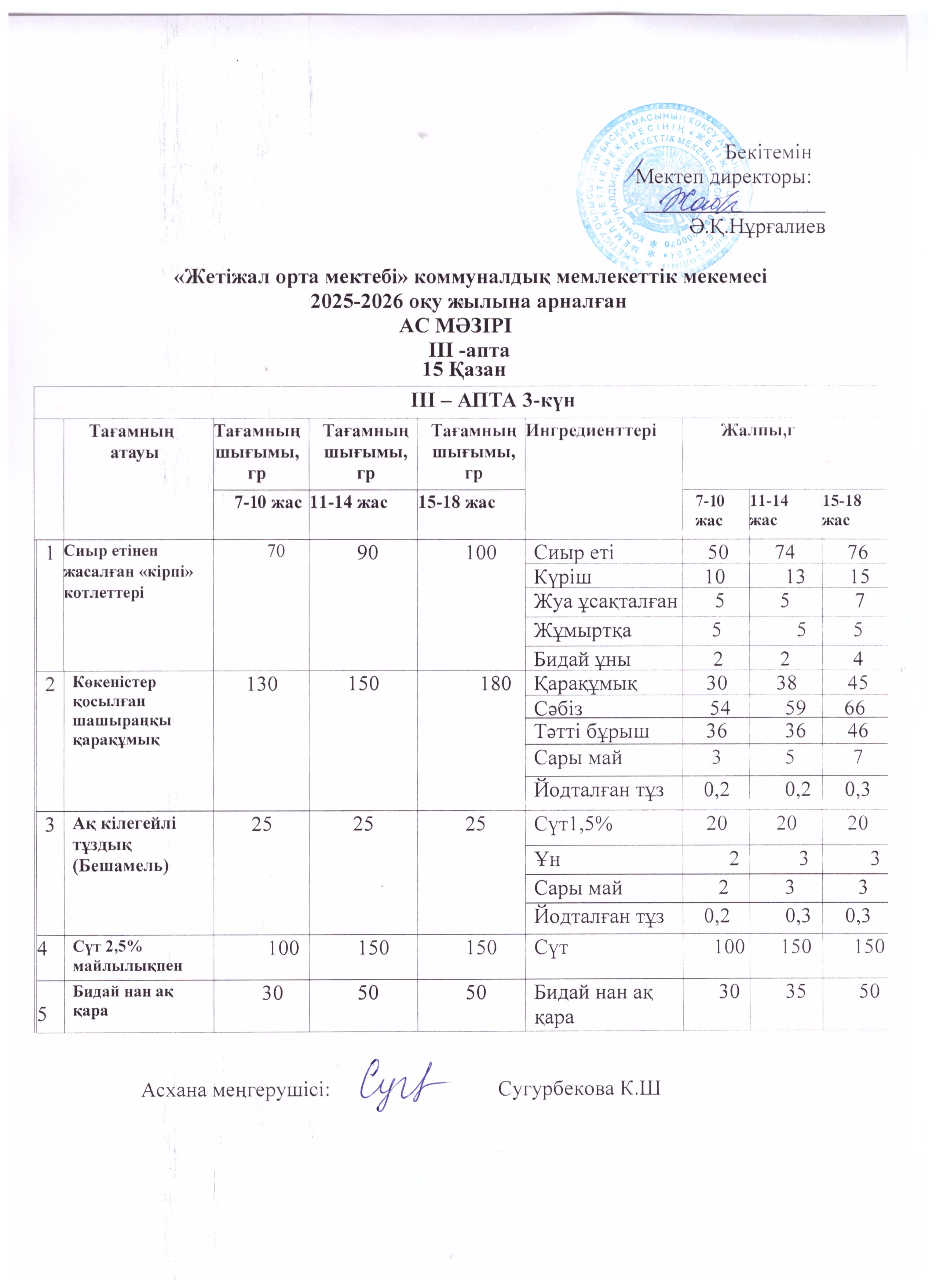 Ас мәзірі 15.10.2025ж » Көксу ауданы Жетіжал орта мектебі