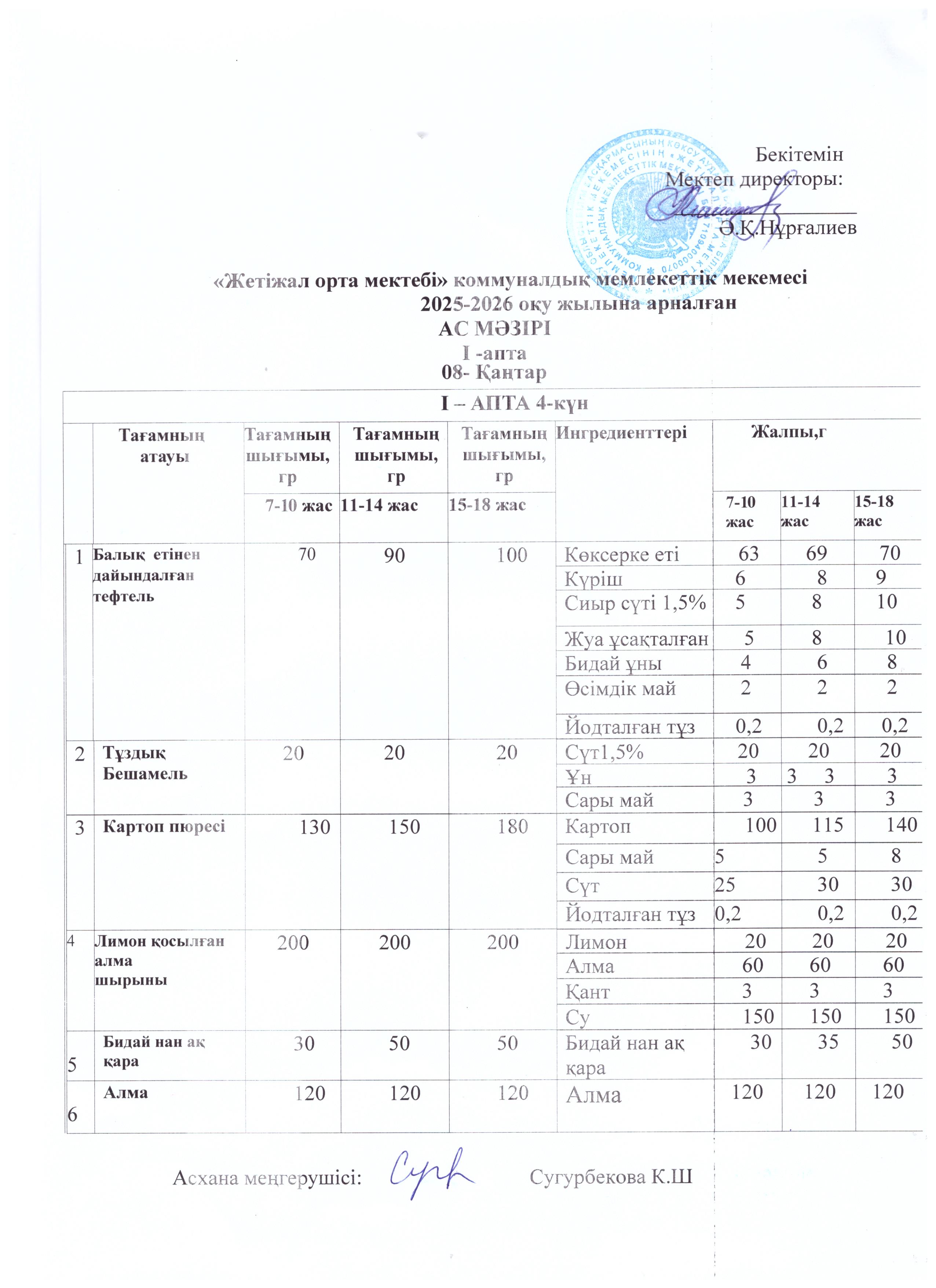 Ас мәзірі 08.01.2026ж » Көксу ауданы Жетіжал орта мектебі