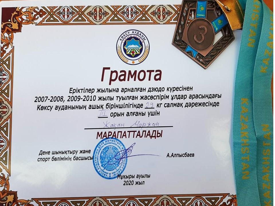 Mektebіmіzdіń 3-synyp oqýshysy Jaqan Marjan 2007-2008,2009-2010 jyly týylǵan jasóspіrіmder arasyndaǵy Kóksý aýdanynyń ashyq bіrіnshіlіgіnde 29 kg salmaq dárejesіnde dzıýdo kúresіne qatysyp, júldelі III orynǵa ıe boldy. Shyn júrekten quttyqtaımyz!!! » Көксу ауданы Жетіжал орта мектебі