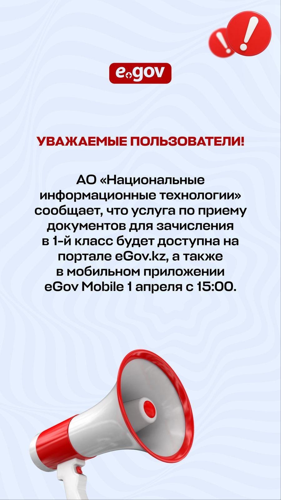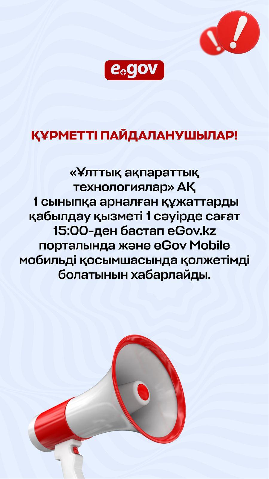 Құрметті пайдаланушылар! «Ұлттық ақпараттық технологиялар» АҚ 1 сыныпқа арналған құжаттарды қабылдау қызметі 1 сәуірде сағат 15:00-ден бастап eGov.kz порталында және eGov Mobile мобильді қосымшасында қолжетімді болатынын хабарлайды.