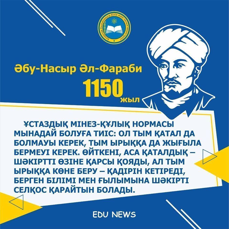 IýNESKO kólemіnde atalyp ótіletіn Uly oıshyl Ábý Nasyr Ál-Farabıdіń 1150 jyldyq mereıtoıy bastaý alǵany belgіlі.