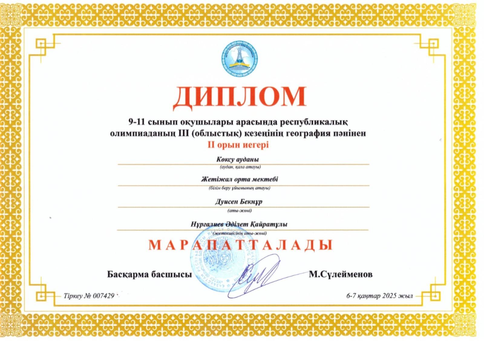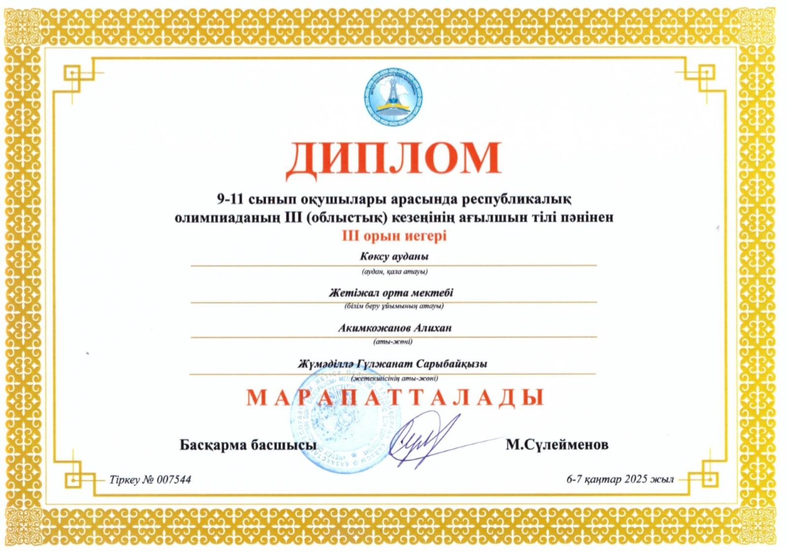 9-11 сынып оқушылары арасында республикалық олимпиаданың ІІІ (облыстық) кезеңіне Жетіжал орта мектебінің 9-сынып оқушысы Акимкожанов Алихан ағылшын тілі пәнінен қатысып, жүлделі ІІІ орынға ие болса, 10-сынып оқушысы Дүйсен Бекнұр география пәнінен қатысып,жүлделі ІІ орынға ие болды. Шын жүректен құттықтаймыз!!! Жетекшілері: Жүмәділлә Г.С., Нұрғалиев Ә.Қ.