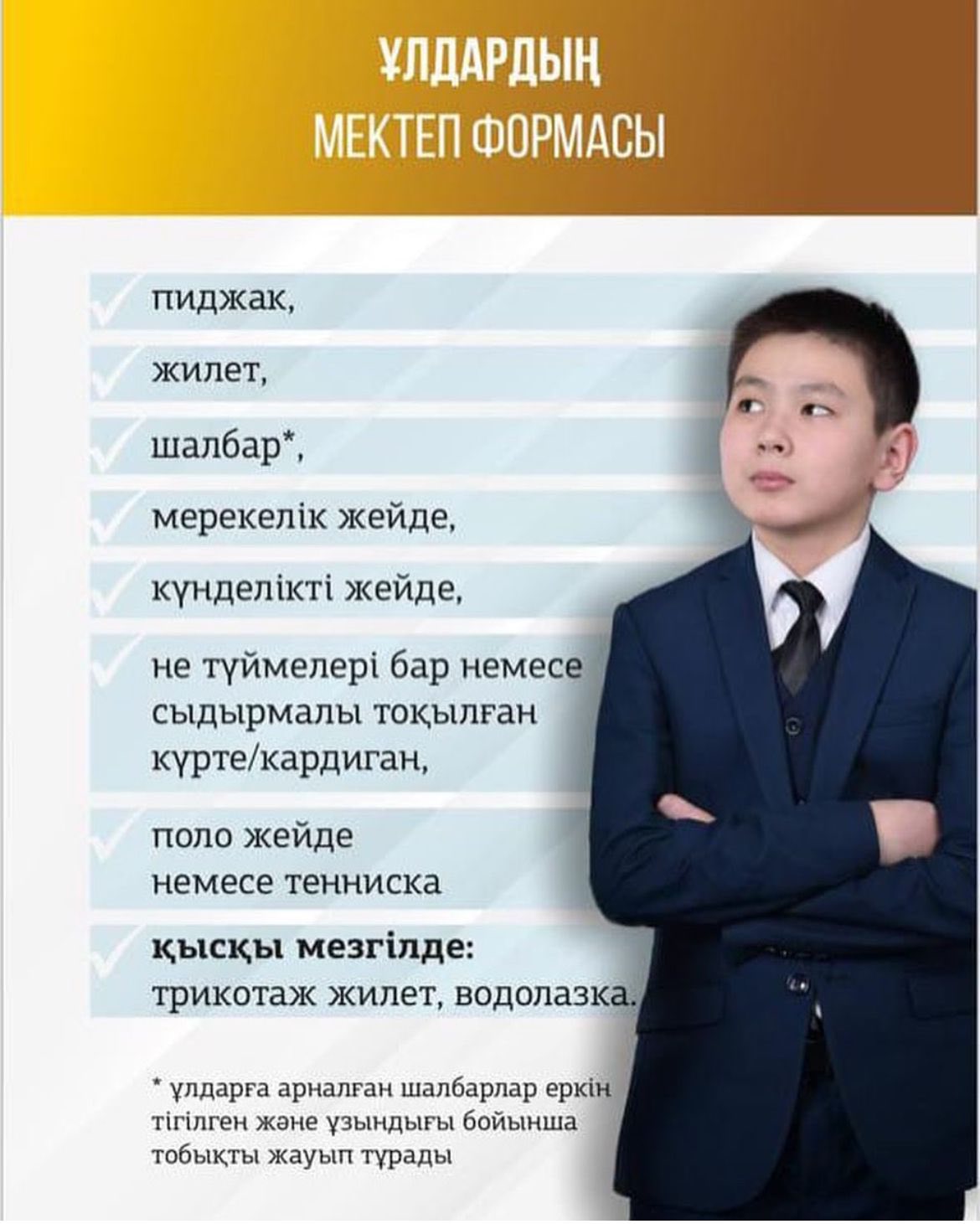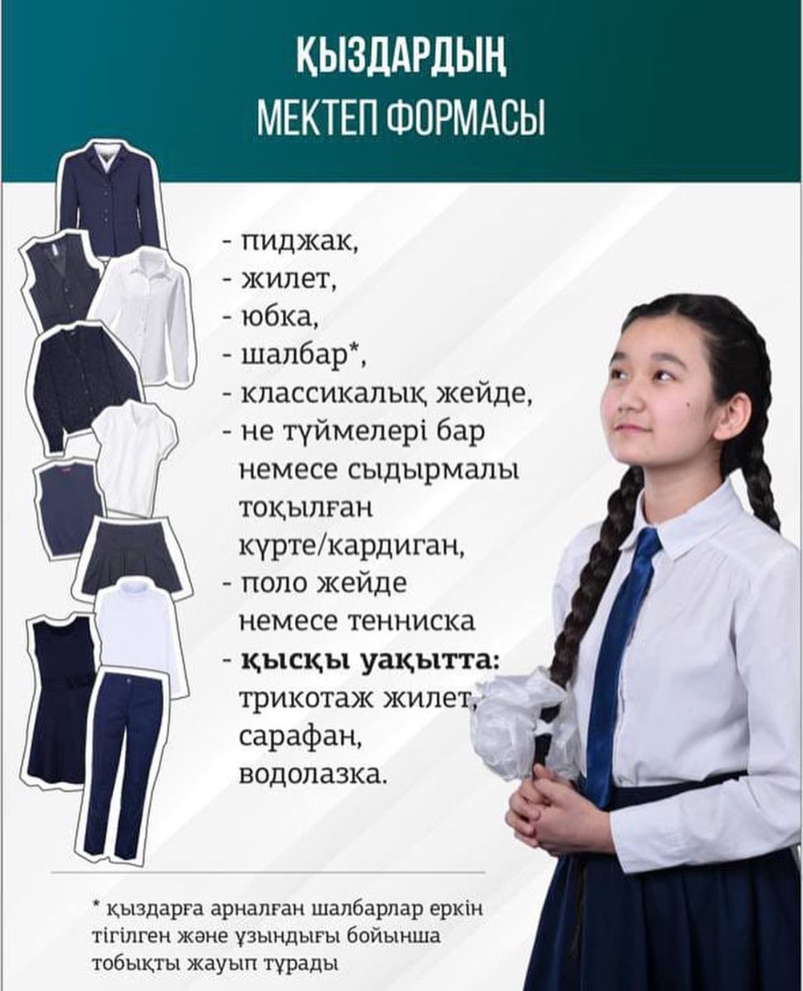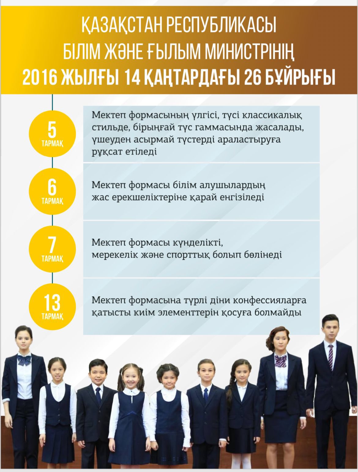 ⚡Қазақстан Республикасының Білім және ғылым министрлігінің 2016 жылғы 14 қаңтардағы #26 бұйрығына сәйкес 2026-2026 оқу жылындағы мектеп формасының үлгісі талапқа сай орындалуы міндетті.
