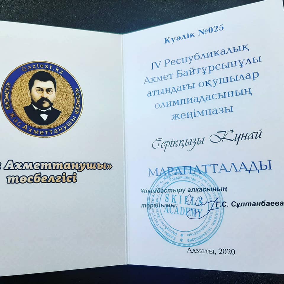 ІV Республикалық Ахмет Байтұрсынұлы атындағы оқушылар олимпиадасына қатысып, жеңімпаз атанғаны үшін 8-сынып оқушысы Серікқызы Күнай ЖасАхметтанушы төсбелгімен марапатталды.Жетекшісі:Мусахметова Г.А.