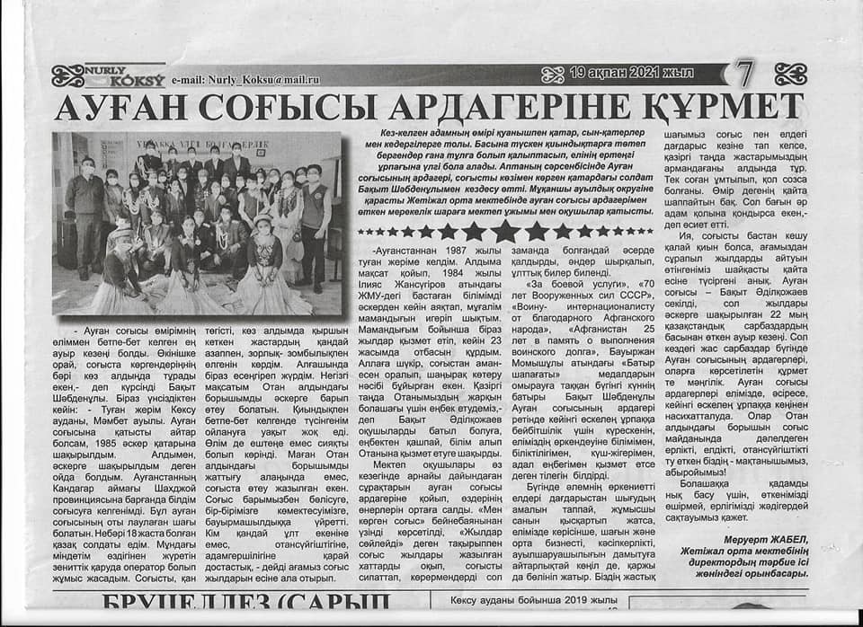 БАҚ өкілдері біз туралы."Ауған соғысы ардагерлеріне құрмет" мақаласы аудандық "Нұрлы Көксу" газетінде жарық көрді.Мақала авторы ДТІЖО: Жабел Меруерт » Көксу ауданы Жетіжал орта мектебі