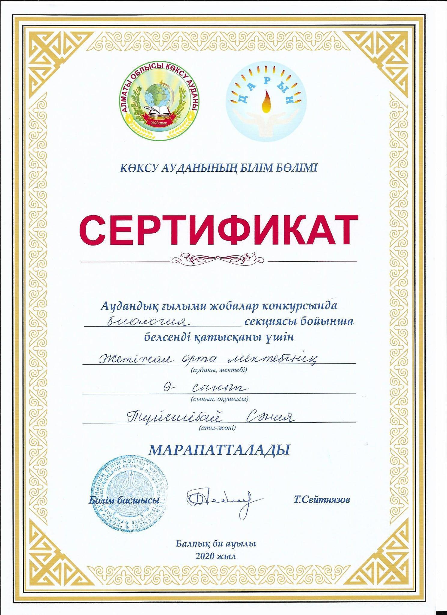 Көксу ауданы Жетіжал орта мектебі » Іс-шаралар » Аудандық ғылыми жобалар конкурсында биология секциясы бойынша белсенді қатысқаны үшін Жетіжал орта мектебінің 9-сынып оқушысы Түйешібай Сания сертификатпен марапатталды. Жетекшісі: Илиясова Р.А. Құттықтаймыз!!!