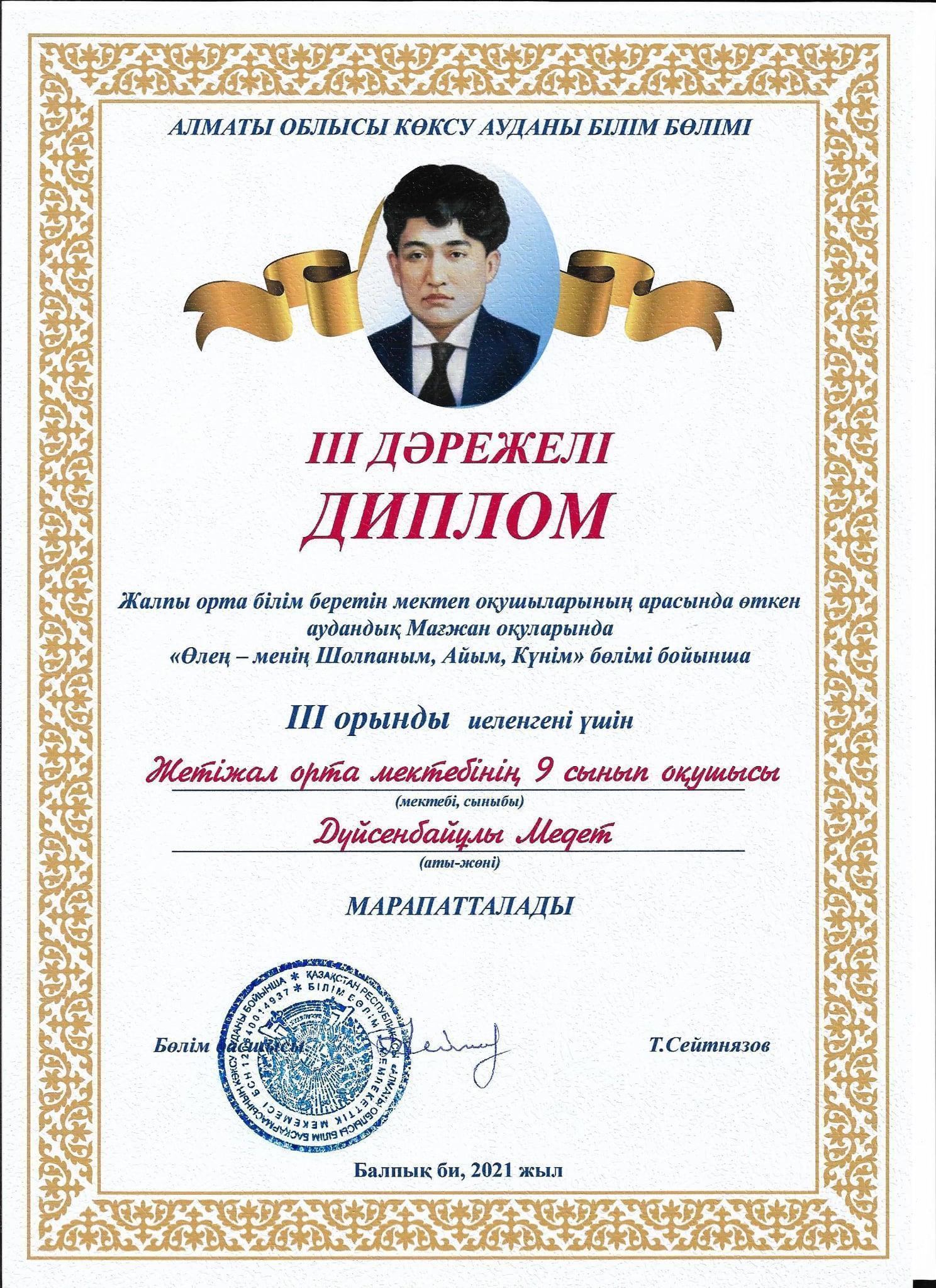 Көксу ауданы Жетіжал орта мектебі » Іс-шаралар » Жалпы білім беретін мектеп оқушыларының арасында өткен аудандық Мағжан оқуларында Жетіжал орта мектебінің 8-сынып оқушысы Серікқызы Күнай, 9-сынып оқушысы Дүйсенбайұлы Медет қатысып, ІІІ дәрежелі дипломмен марапатталды.Шын жүректен құттықтаймыз!!!