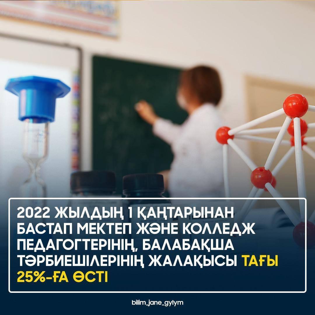 2022 ЖЫЛДЫҢ 1 ҚАҢТАРЫНАН БАСТАП МЕКТЕП ЖӘНЕ КОЛЛЕДЖ ПЕДАГОГТЕРІНІҢ, БАЛАБАҚША ТӘРБИЕШІЛЕРІНІҢ ЖАЛАҚЫСЫ ТАҒЫ 25%-ҒА ӨСТІ