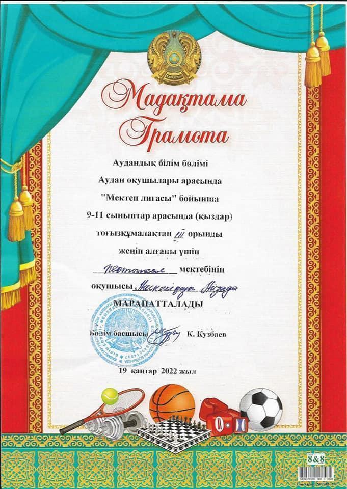 Аудан оқушылары арасында "Мектеп лигасы" бойынша 9-11 сыныптар арасында (қыздар) тоғызқұмалақтан ІІІ орынды жеңіп алғаны үшін Жетіжал орта мектебінің 11-сынып оқушысы Ашкейқызы Айзада мадақтамамен марапатталды.Шын жүректен құттықтаймыз!!! Көксу Ауданы Білім Бөлімі