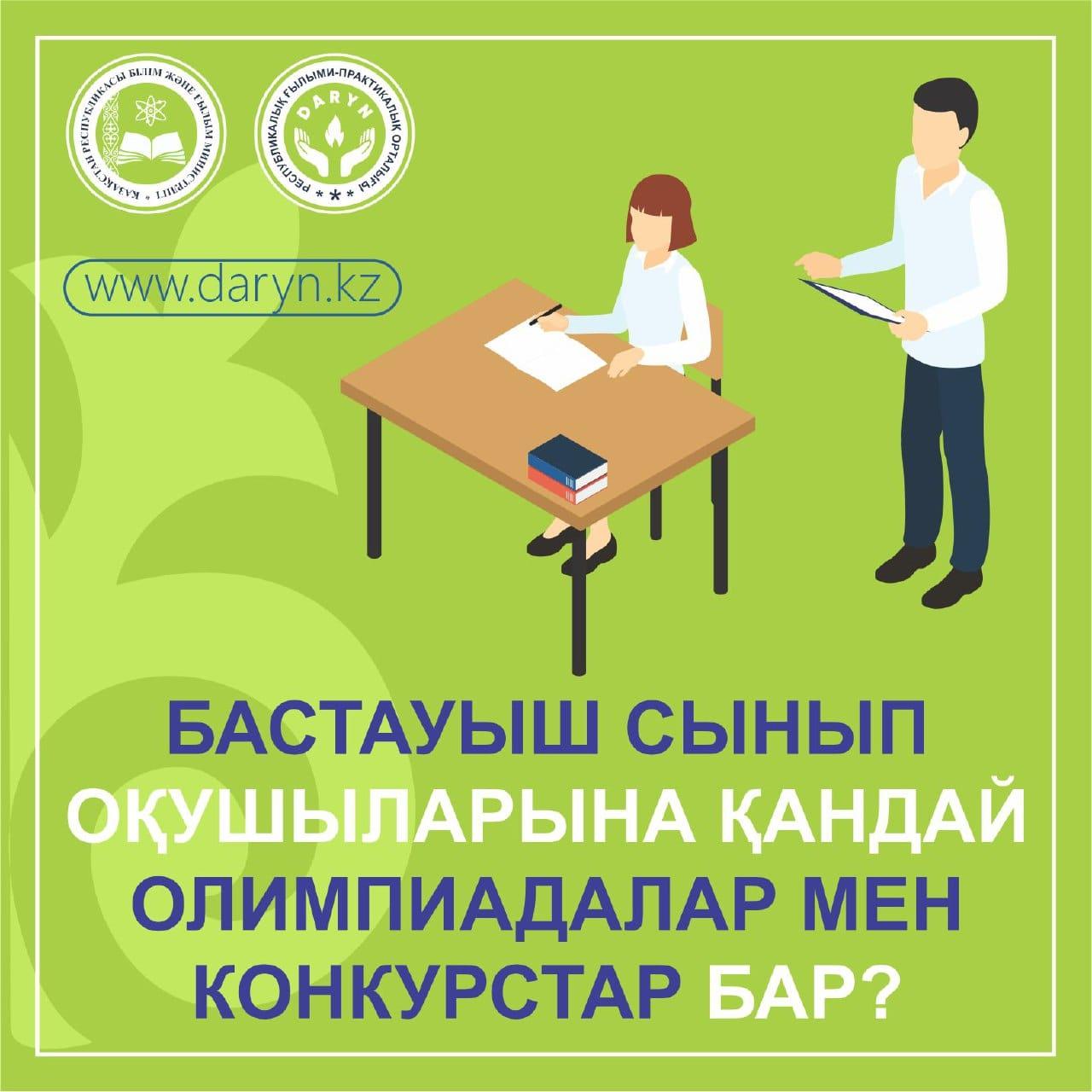 – Жалпы білім беретін пәндер бойынша 2-4 сынып оқушыларына арналған республикалық олимпиада, 1-7-сынып оқушыларының облыстық «Зерде» зерттеу жұмыстары мен шығармашылық жобалар конкурсы, «Бастау» республикалық математикалық конкурсын өткіземіз.