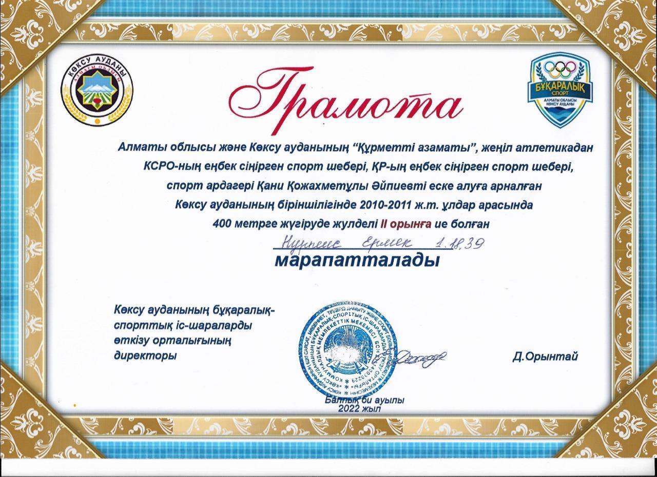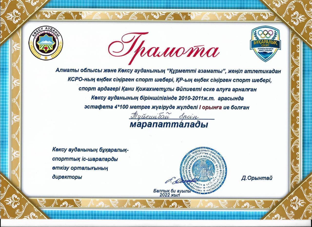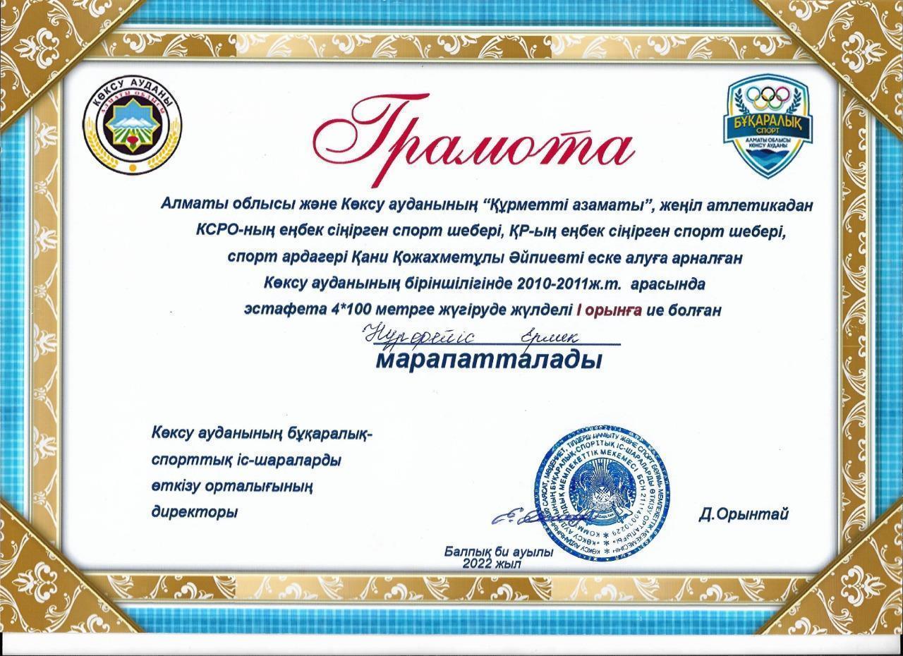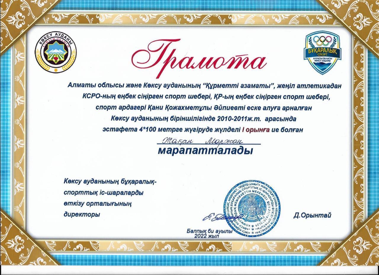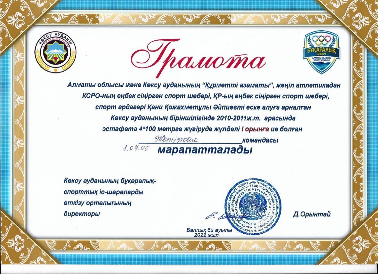 Алматы облысы және Көксу ауданының "Құрметті азаматы", жеңіл атлетикадын КСРО-ның еңбек сіңірген спорт шебері, ҚР-ның еңбек сіңірген спорт шебері, спорт ардагері Қани Қожахметұлы Әйпиевты еске алуға арналған Көксу ауданының біріншілігінде 2010-2011ж.т. арасында эстафета 4*100 метрге жүгіруде жүлделі І орынды Жетіжа орта мектебінің командасы жеңіп алды. Команда мүшелері: Нұрфейіс Ермек, Құдайберген Кәусар, Жақан Маржан, Түйешібай Ерсін. Жетекшісі: Тлеуов И.К.