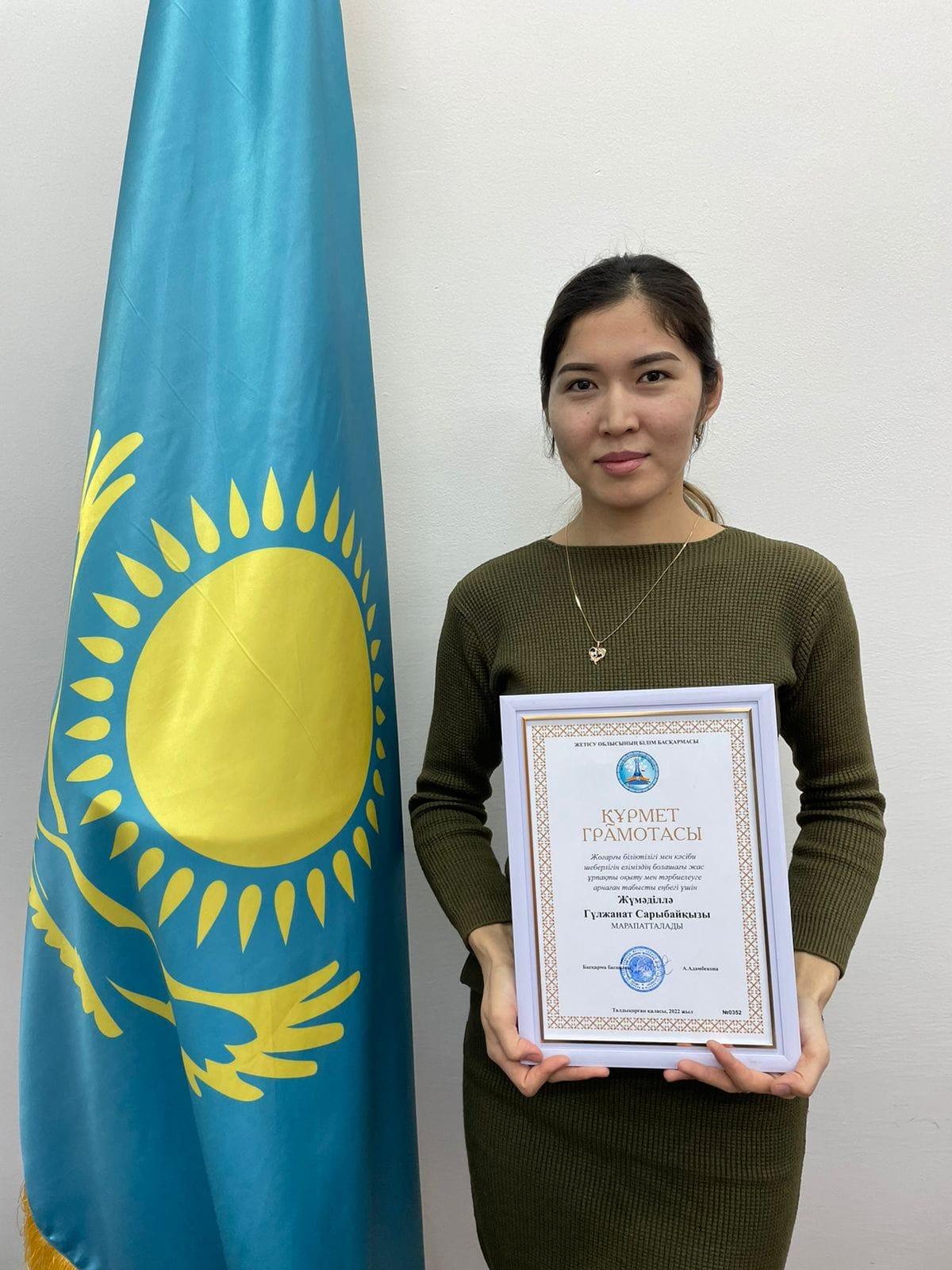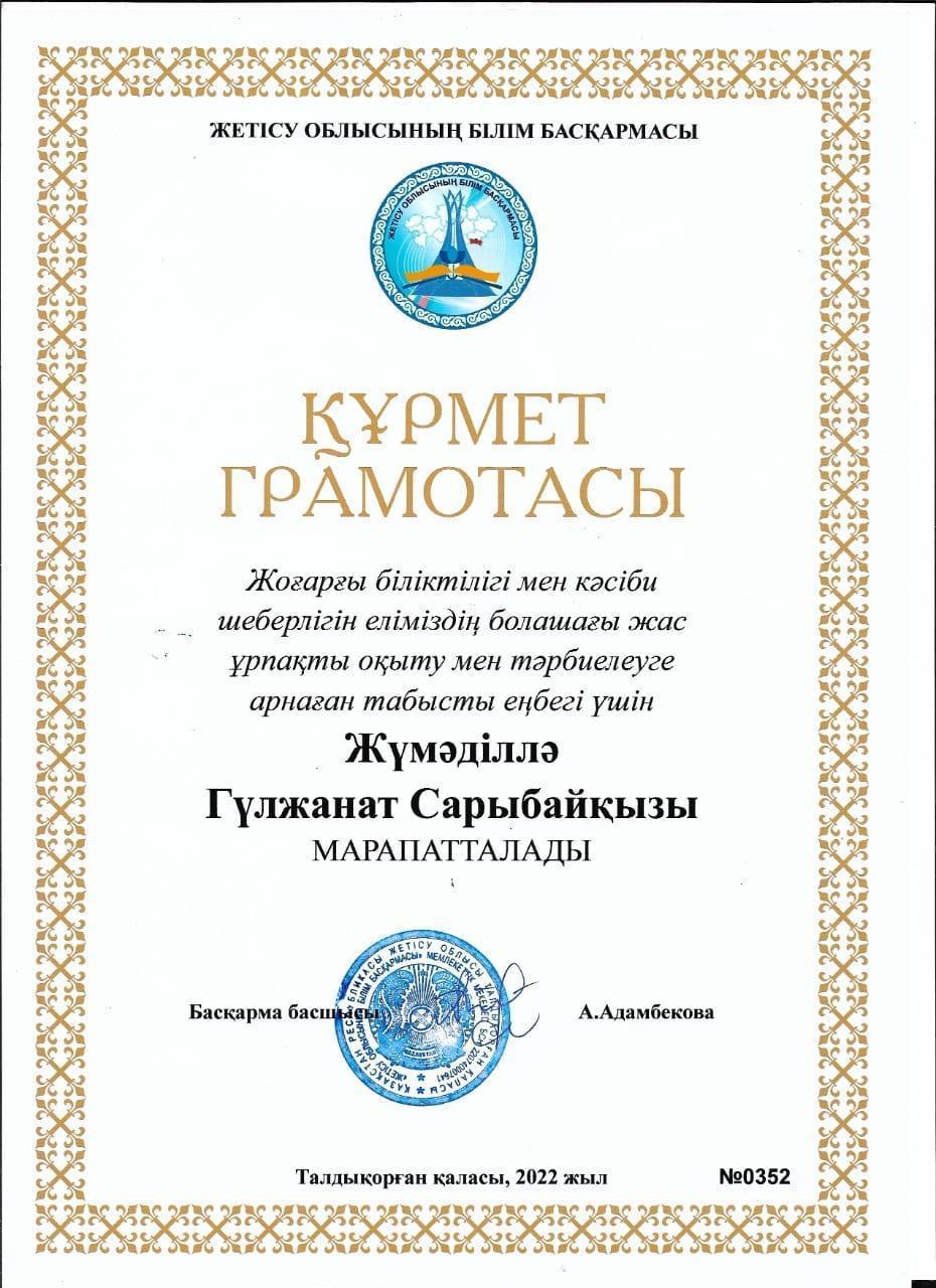Көксу ауданы Жетіжал орта мектебі » Іс-шаралар » 16 желтоқсан "Тәуелсіздік күні" мерекесі қарсаңында мектебіміздің ағылшын тілі пәні мұғалімі Жүмәділлә Гүлжанат Сарыбайқызы Жетісу облысы білім басқармасының құрмет грамотасымен марапатталды!!!Шын жүректен құттықтаймыз!!!