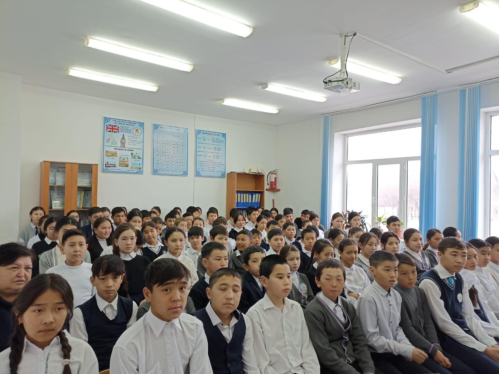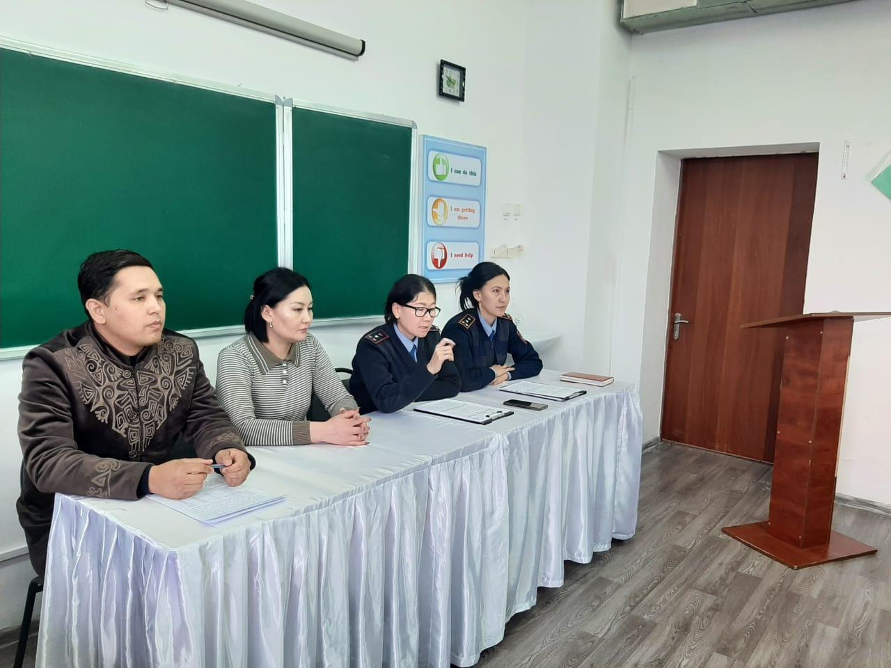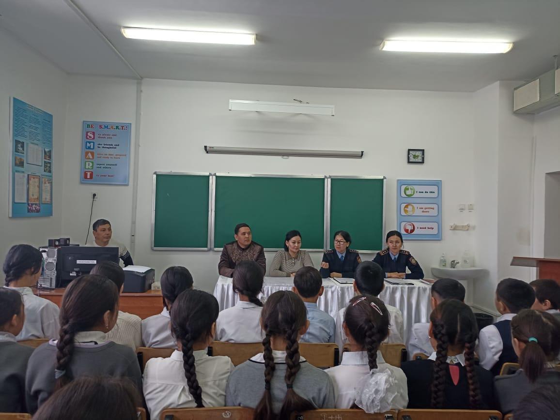 5-11сынып оқушылары арасында мектепке тыйым салынған заттарды әкелмеу, кәмелет жасқа толмаған оқушылар арасындағы құқықбұзушылықтың алдын-алу тақырыбында түсіндірме жұмыстары жүргізіліп кездесу өткізіліп толық ақпарат берілді. Оқушылар өздерінің қызықтырған сұрақтарына қанағаттанарлықтай деңгейде жауаптарын алды.