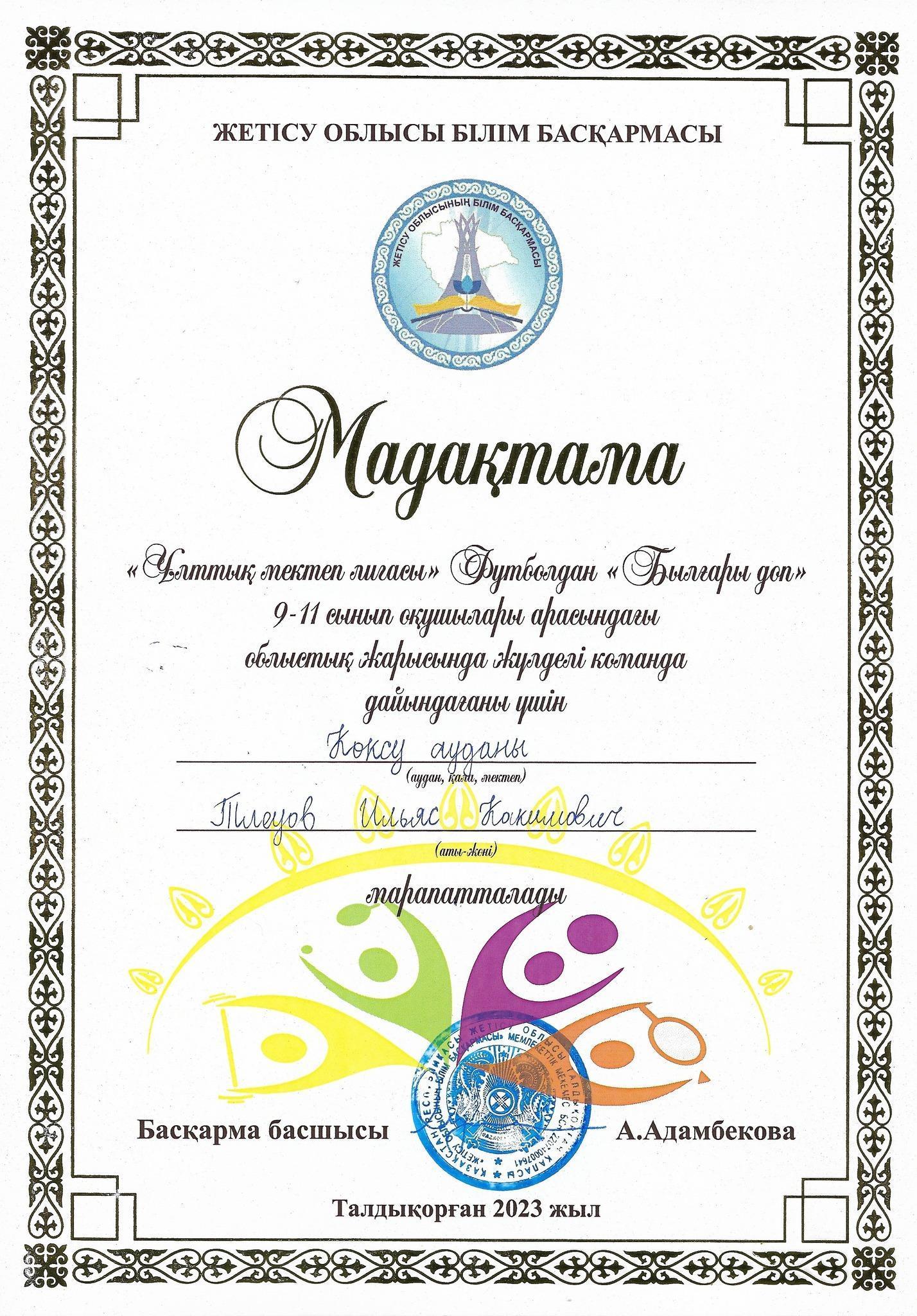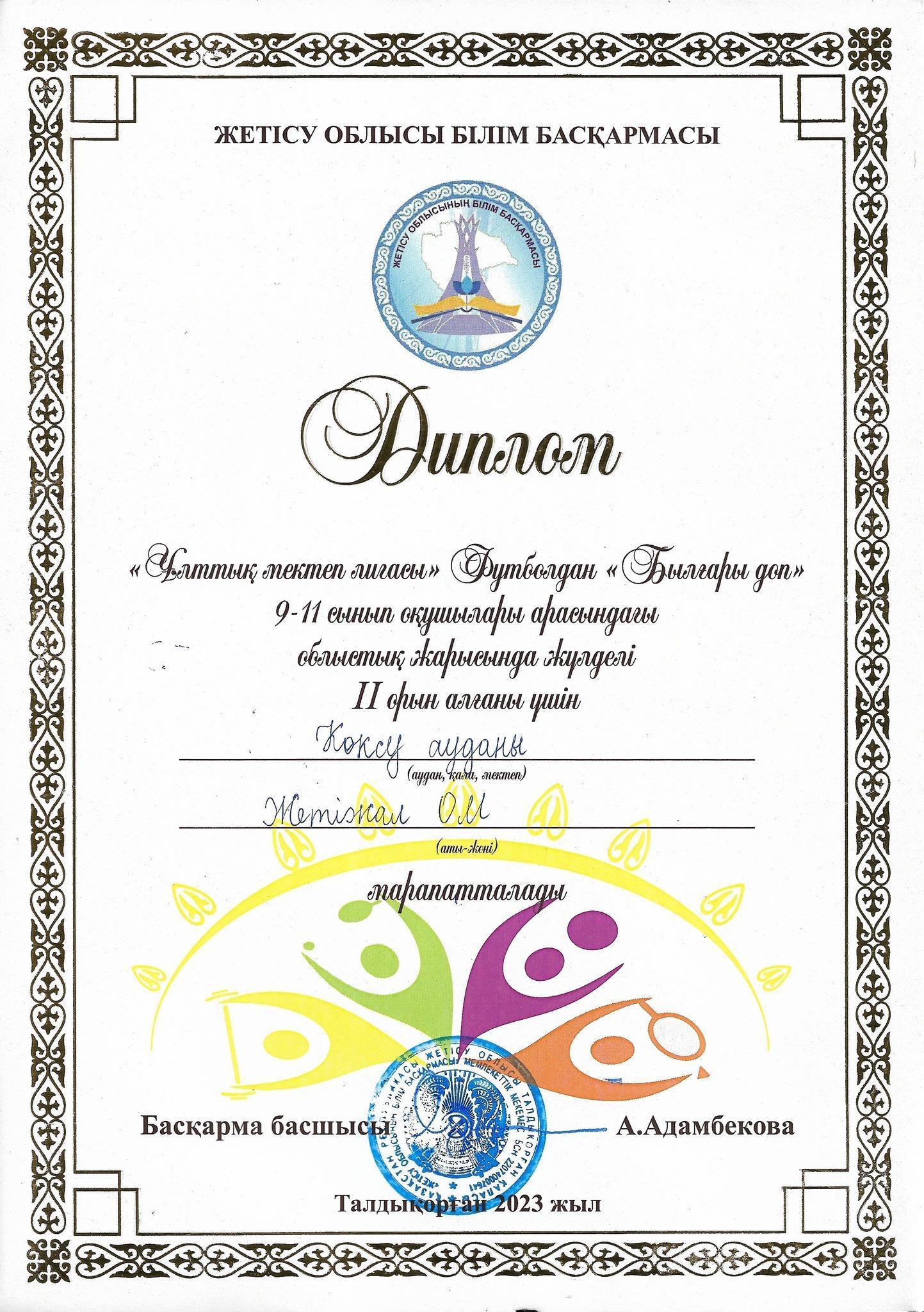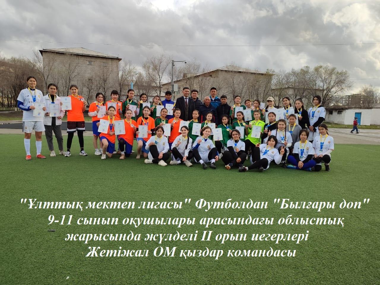 "Ұлттық мектеп лигасы" Футболдан "Былғары доп" 9-11 сынып оқушылары арасындағы облыстық жарысында жүлделі ІІ орынға ие болғаны үшін Жетіжал ОМ "ҚЫЗДАР" КОМАНДАСЫ дәрежелі дипломмен марапатталды. Жетекшісі: Тлеуов И.К.