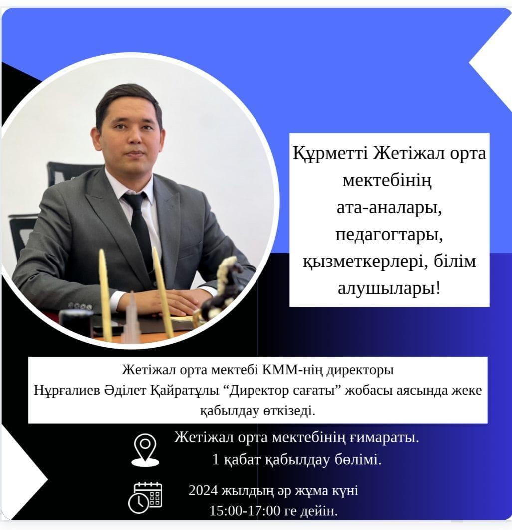 Көксу ауданы білім бөлімі мемлекеттік мекемесінің Жетіжал орта мектебі КММ бойынша 19.01.2023ж "Директор сағаты" білім алушылар мен ата-аналардың және педагогтердің жеке сұрақтары бойынша директордың жеке қабылдауы жүргізіледі.@marat.suleimenov81 @marlen_kolbaev @koksu_bilim @zhetysu_bilim
