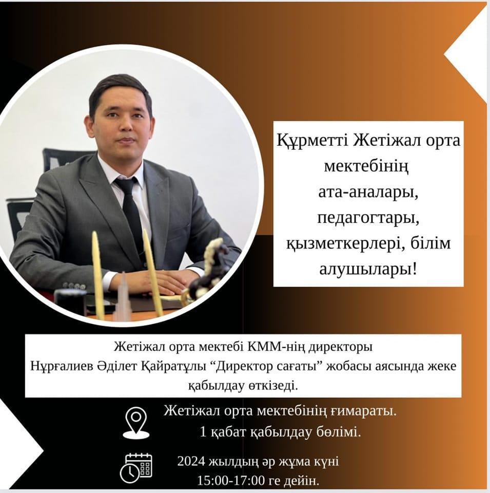 Көксу ауданы білім бөлімі мемлекеттік мекемесінің Жетіжал орта мектебі КММ бойынша 26.01.2024ж. "Директор сағаты" білім алушылар мен ата-аналардың және педагогтердің жеке сұрақтары бойынша директордың жеке қабылдауы жүргізіледі.@marat.suleimenov81 @marlen_kolbaev @koksu_bilim @zhetysu_bilim