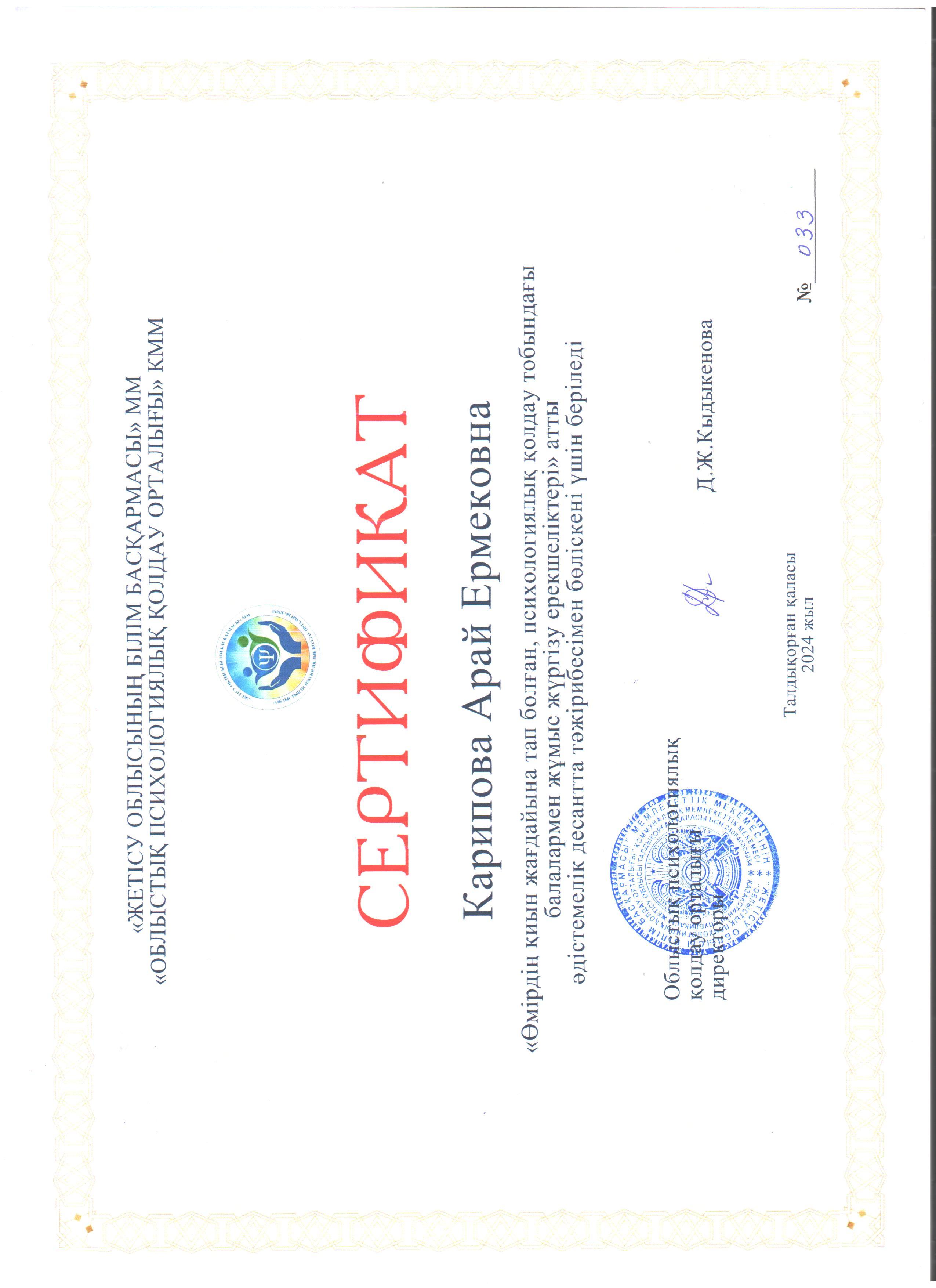 "Өмірдің қиын жағдайына тап болған, психологиялық қолдау тобындағы баллармен жұмыс жүргізу ерекшеліктері" атты әдістемелік десантта Жетіжал орта мектебінің педагог-психологі Карипова Арай Ермековна өз іс-тәжірибесімен бөлісті. » Көксу ауданы Жетіжал орта мектебі