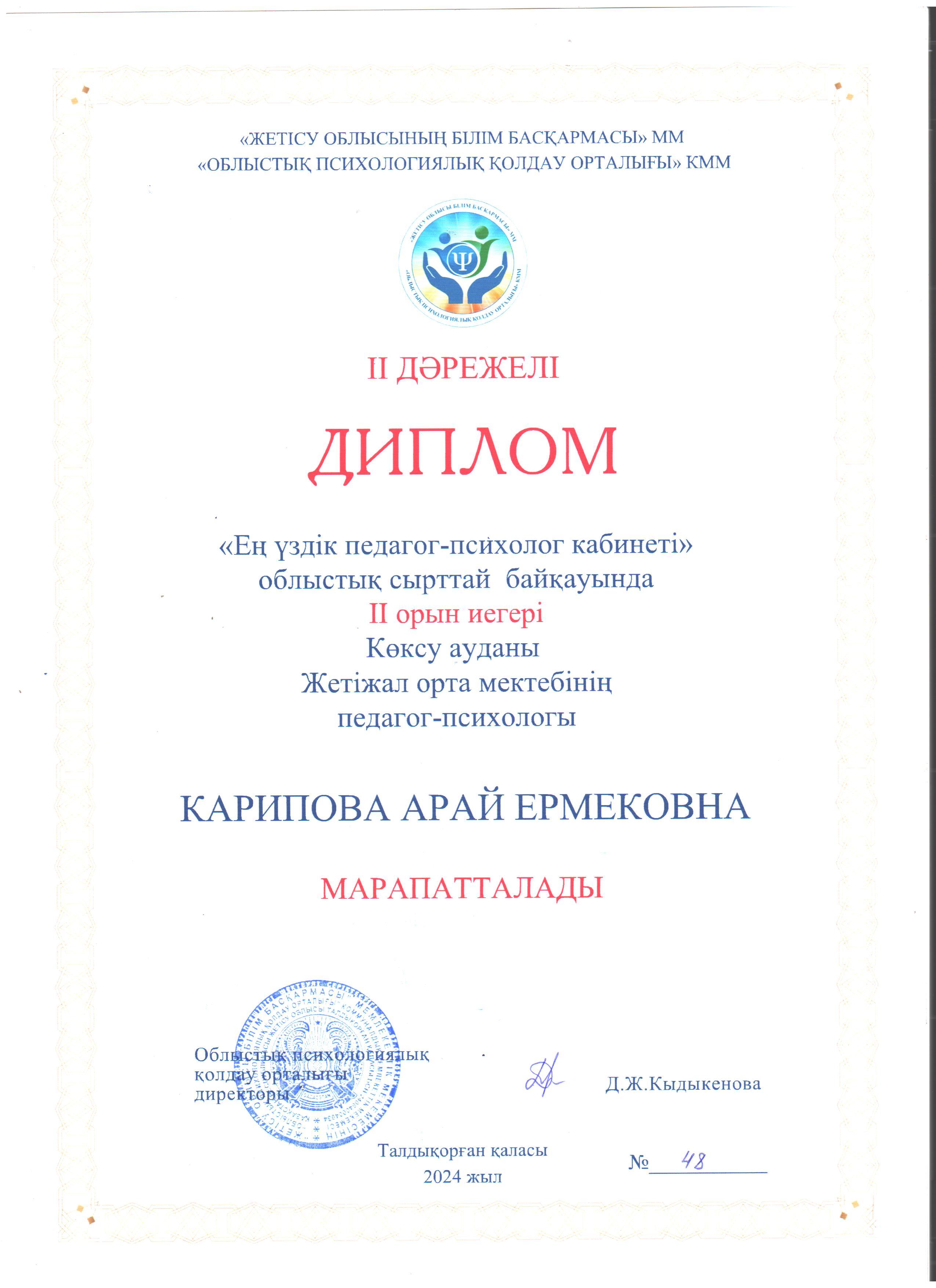 "Ең үздік педагог-психолог кабинеті" облыстық сырттай байқауында ІІ орын иегері Көксу ауданы Жетіжал орта мектебінің педагог-психологі Карипова Арай Ермековна жеңімпаз атанды. Шын жүректен құттықтаймыз!!!