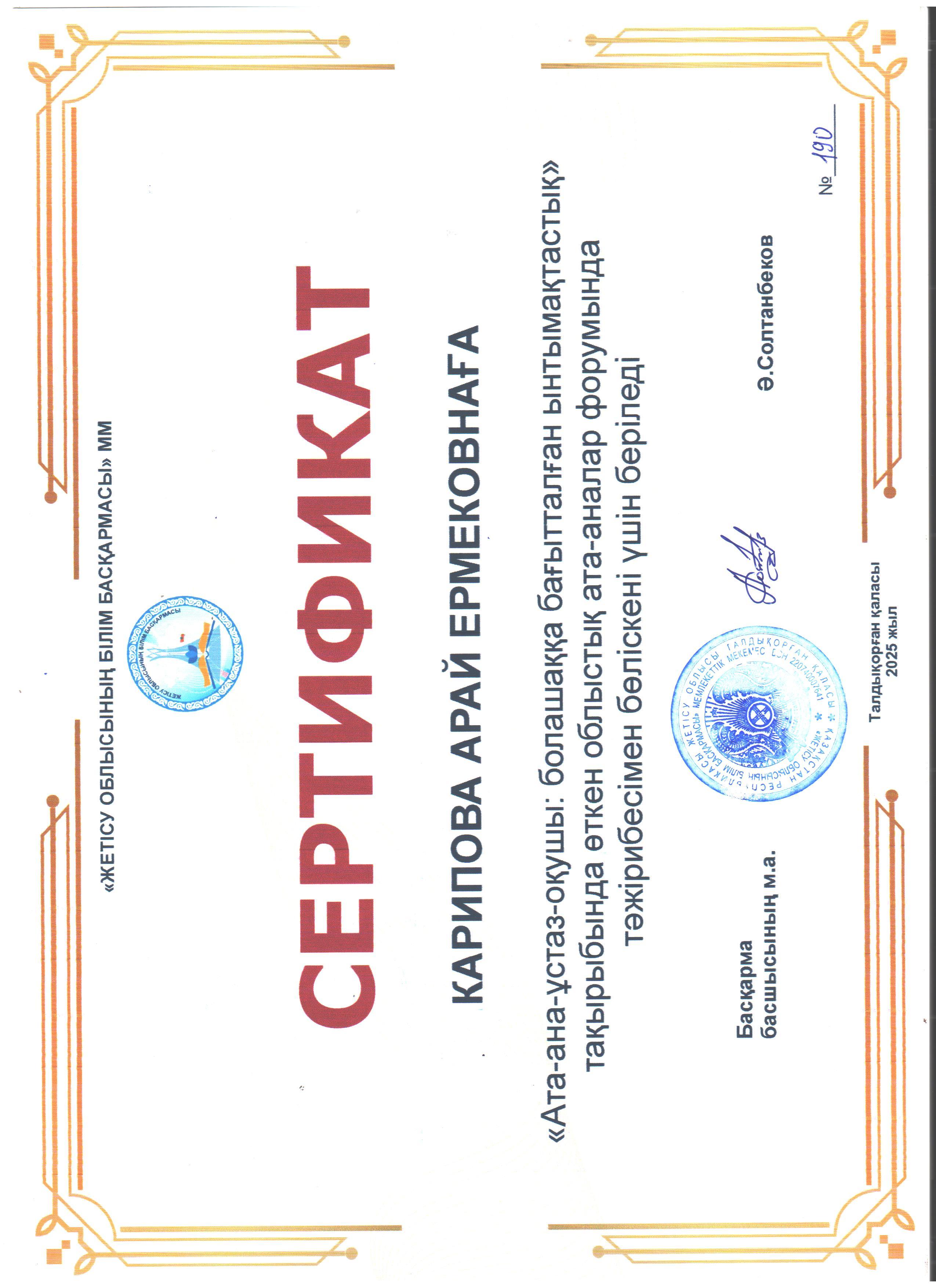 Көксу ауданы Жетіжал орта мектебі » Біз туралы » Әдістемелік жұмыстар » "Ата-ана-ұстаз-оқушы: болашаққа бағытталған ынтымақтастық" тақырыбында өткен облыстық ата-аналар форумында мектебіміздің педагог-психологі Карипова Арай Ермековна іс-тәжірибесімен бөлісті. Жарайсыз!!!