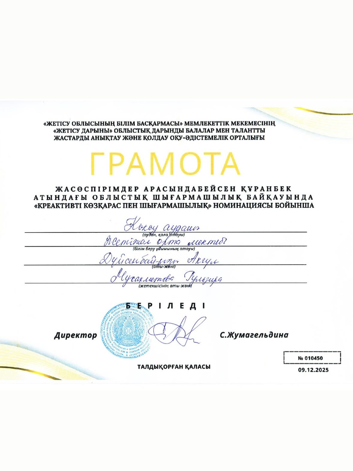 Көксу ауданы Жетіжал орта мектебінің 9-сынып оқушысы Дүйсенбайқызы Ақгүл жүлделі марапатқа ие болды!