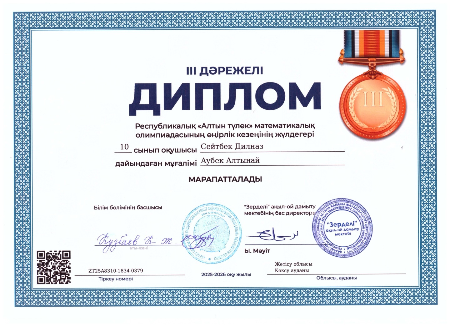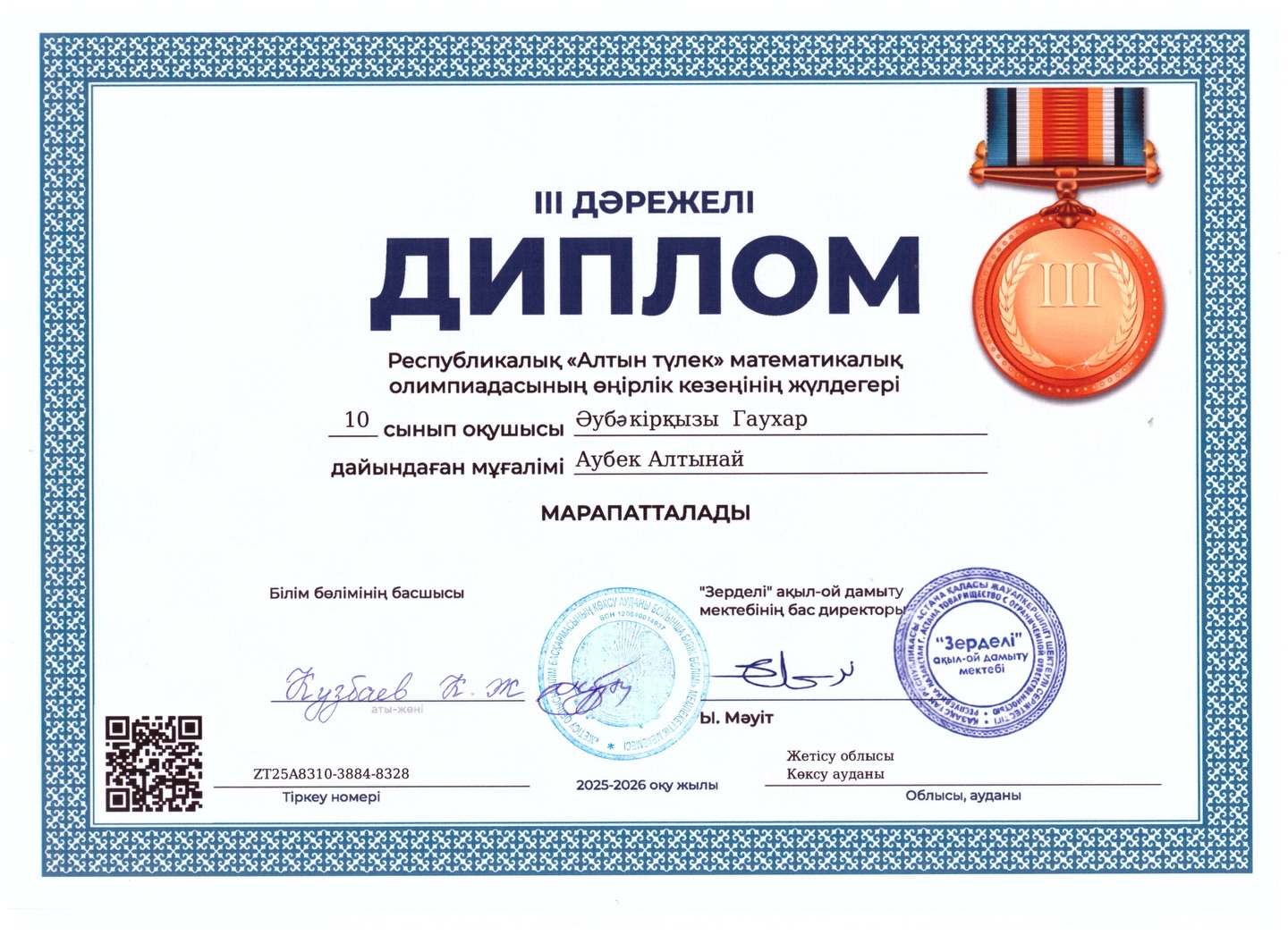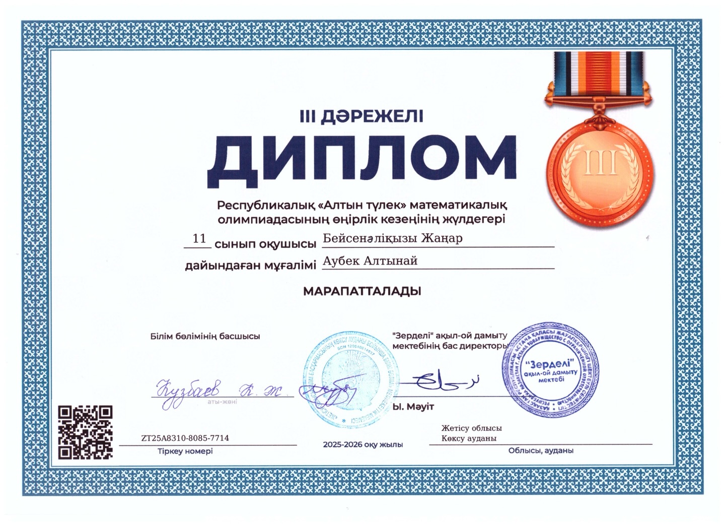 04 февраль 2026 0 1 2 3 4 5 «Алтын түлек» математикалық олимпиадасының өңірлік кезеңі Білім мен логиканы серік еткен шәкірттеріміз республикалық «Алтын түлек» математикалық олимпиадасының өңірлік кезеңінде жоғары нәтиже көрсетті. Барша жүлдегерлерді шын жүректен құттықтаймыз!