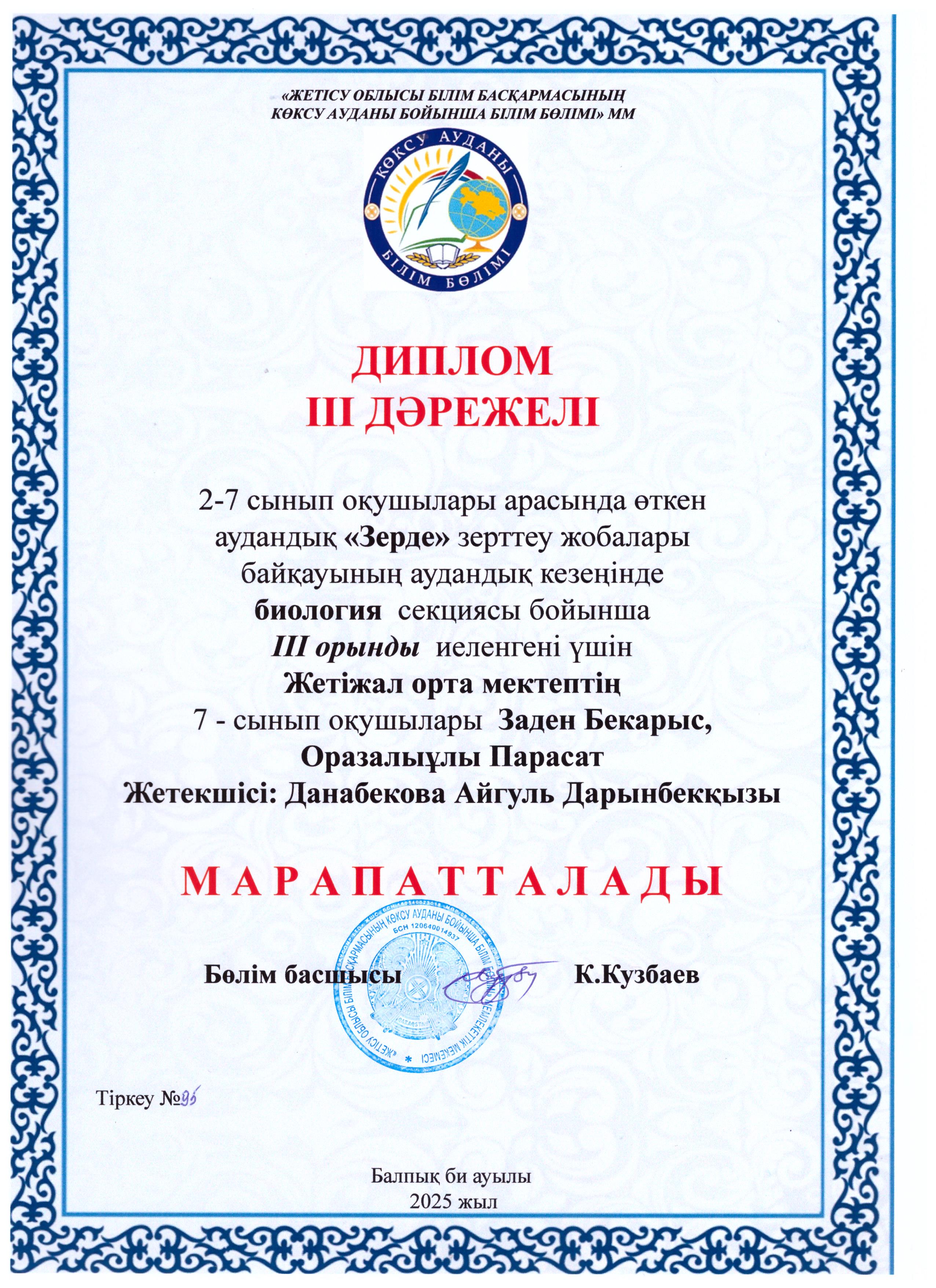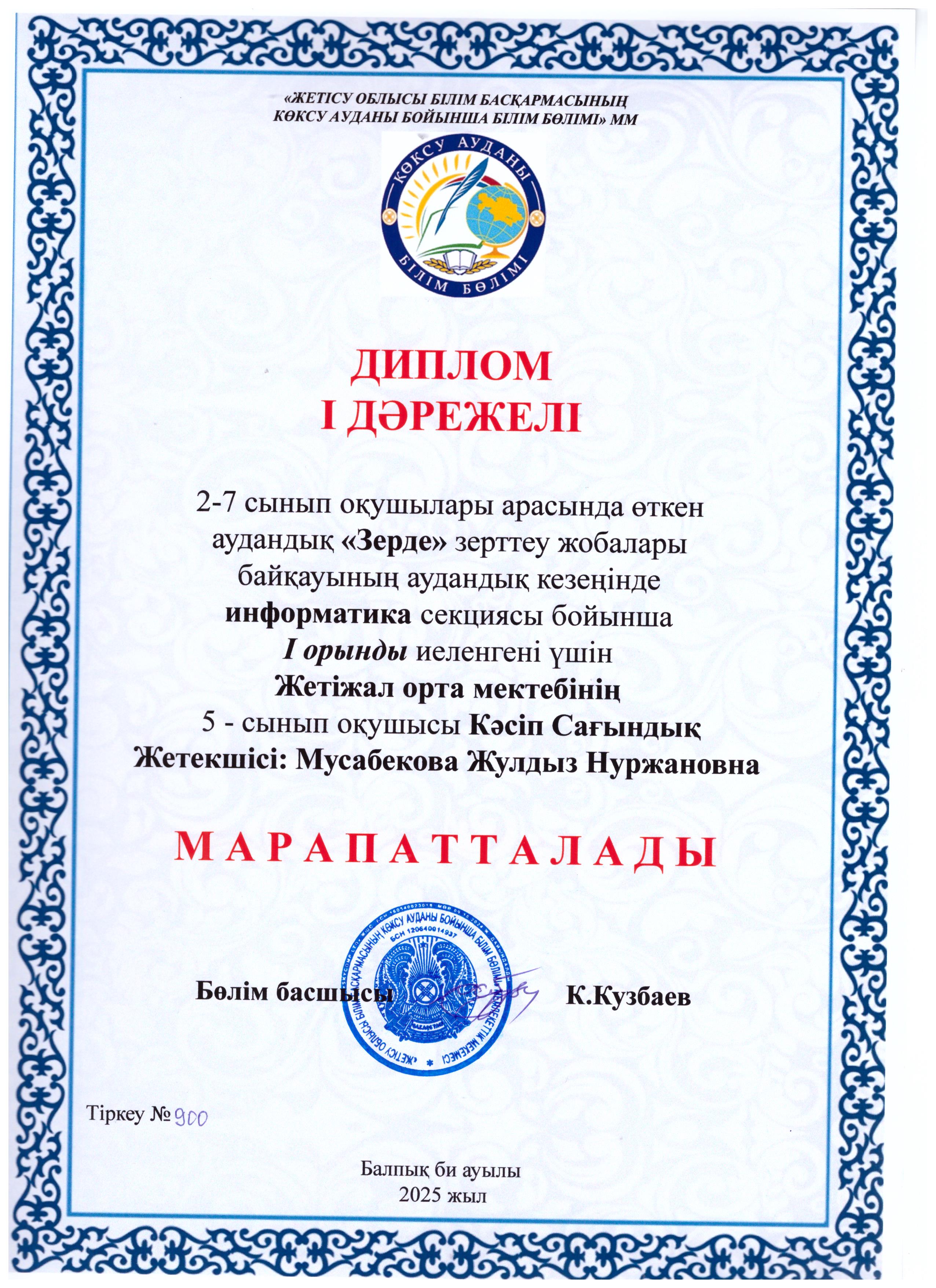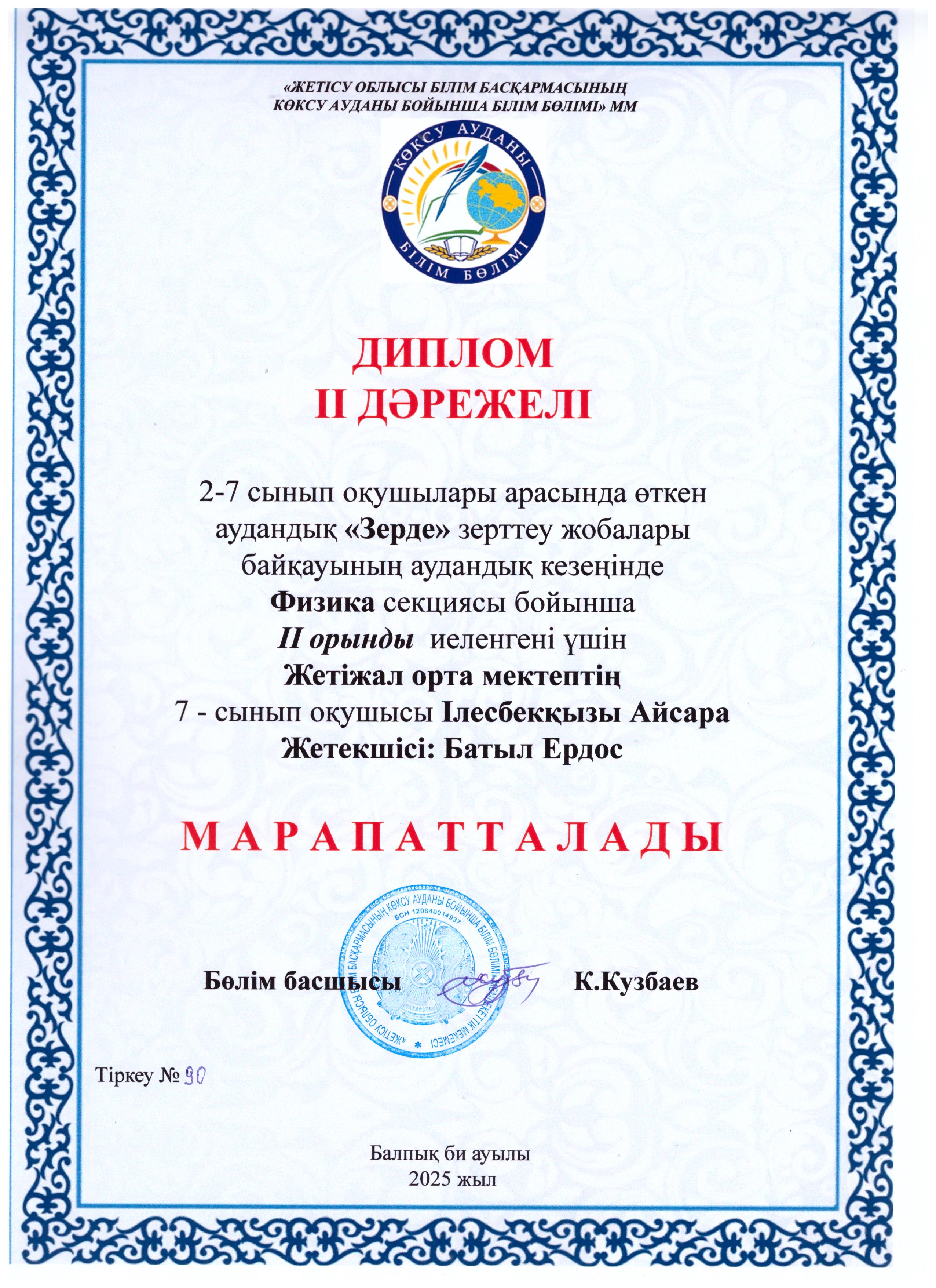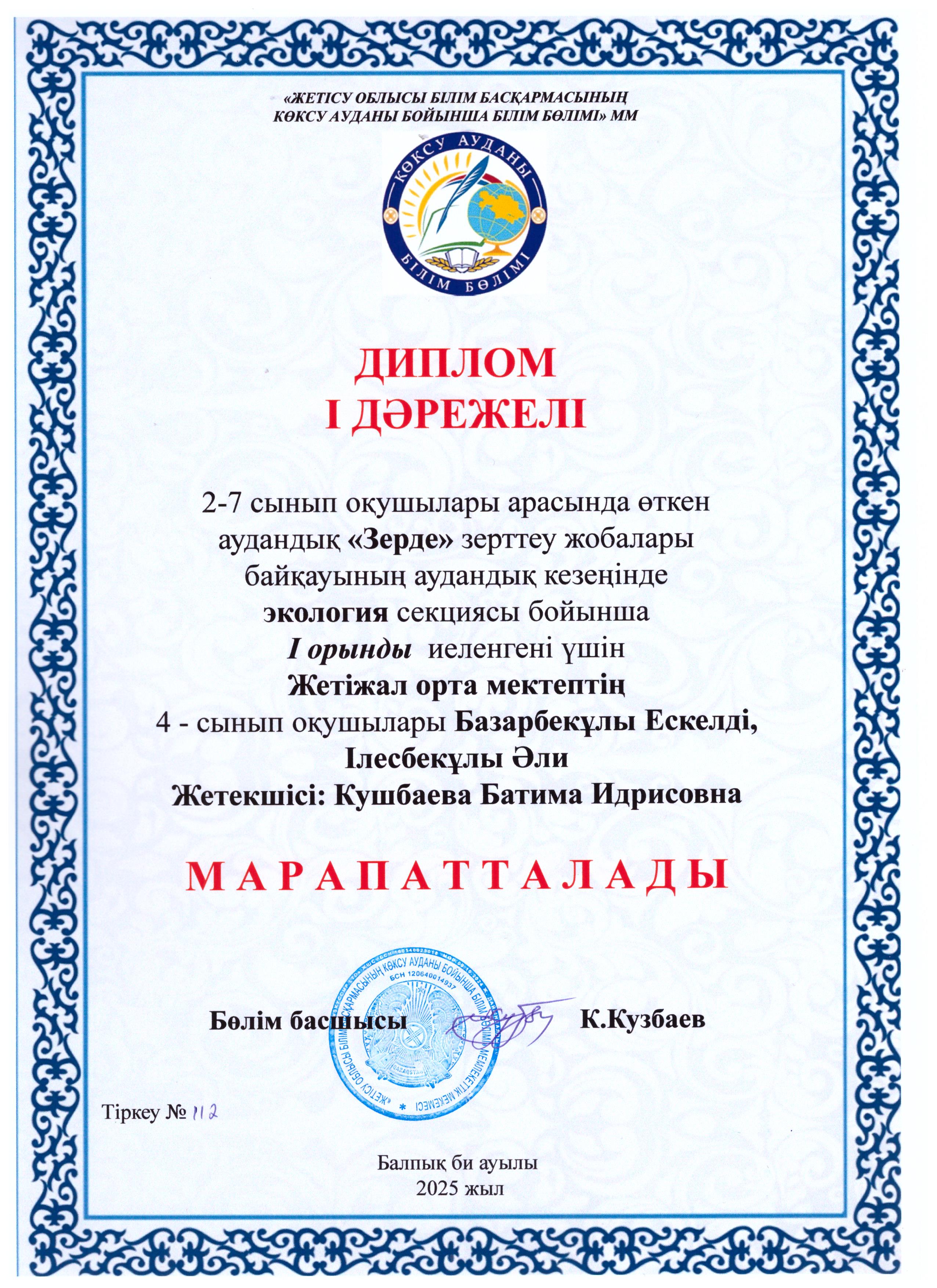 2–7 сынып оқушылары арасында өткен аудандық «Зерде» ғылыми-зерттеу жобалары байқауының аудандық кезеңінде информатика, өлкетану, технология және өнер, роботехника, экология, биология, физика, химиясекциялары бойынша жүлделі орындарға ие болған оқушыларымызды шын жүректен құттықтаймыз!