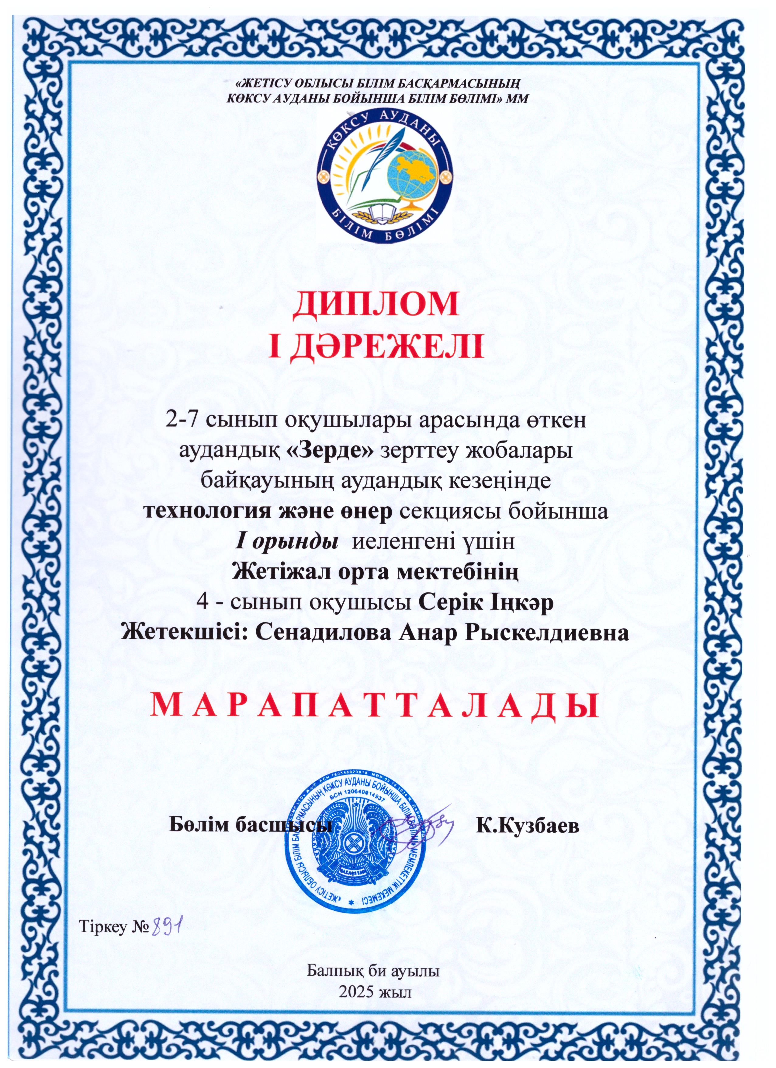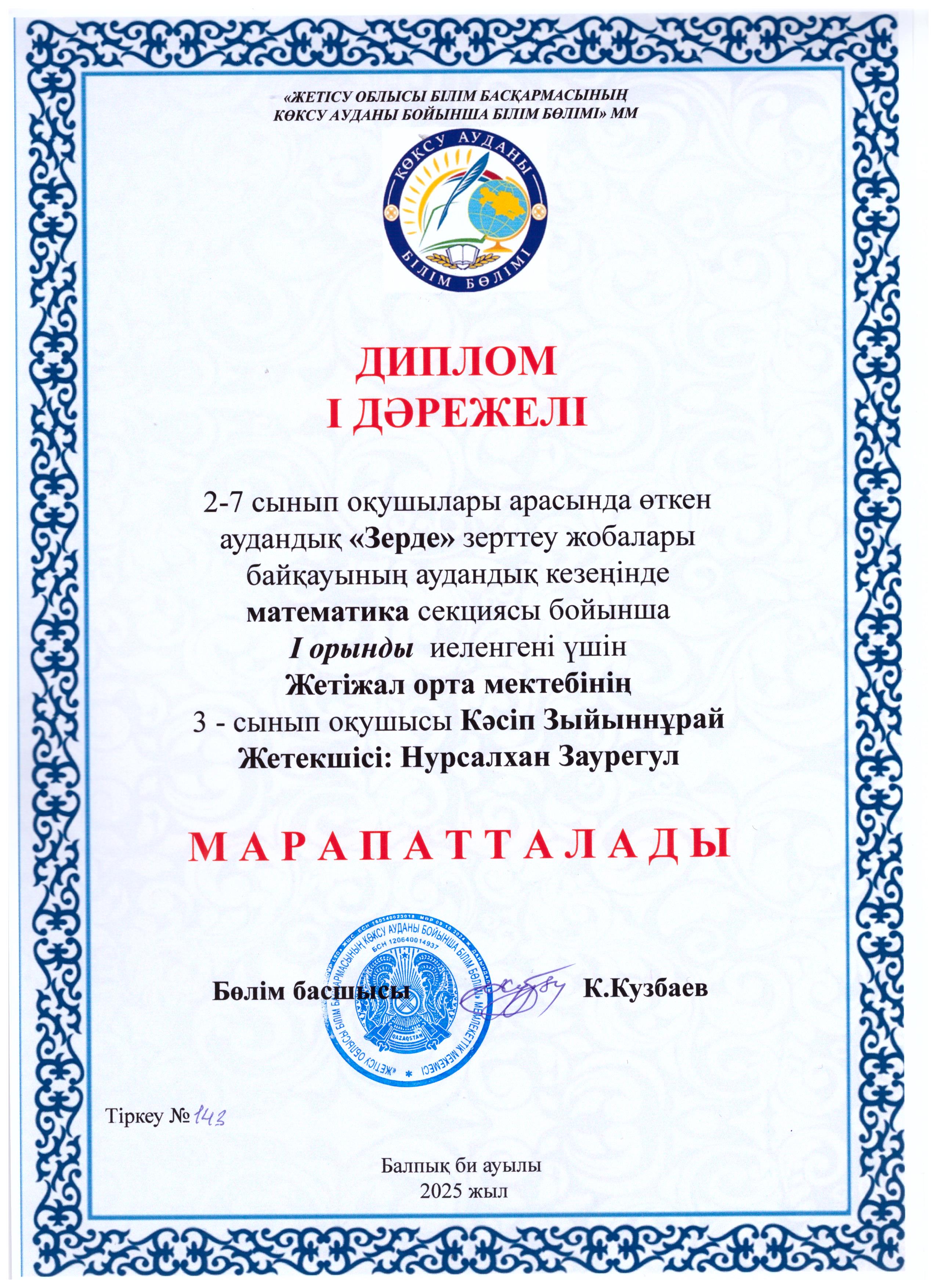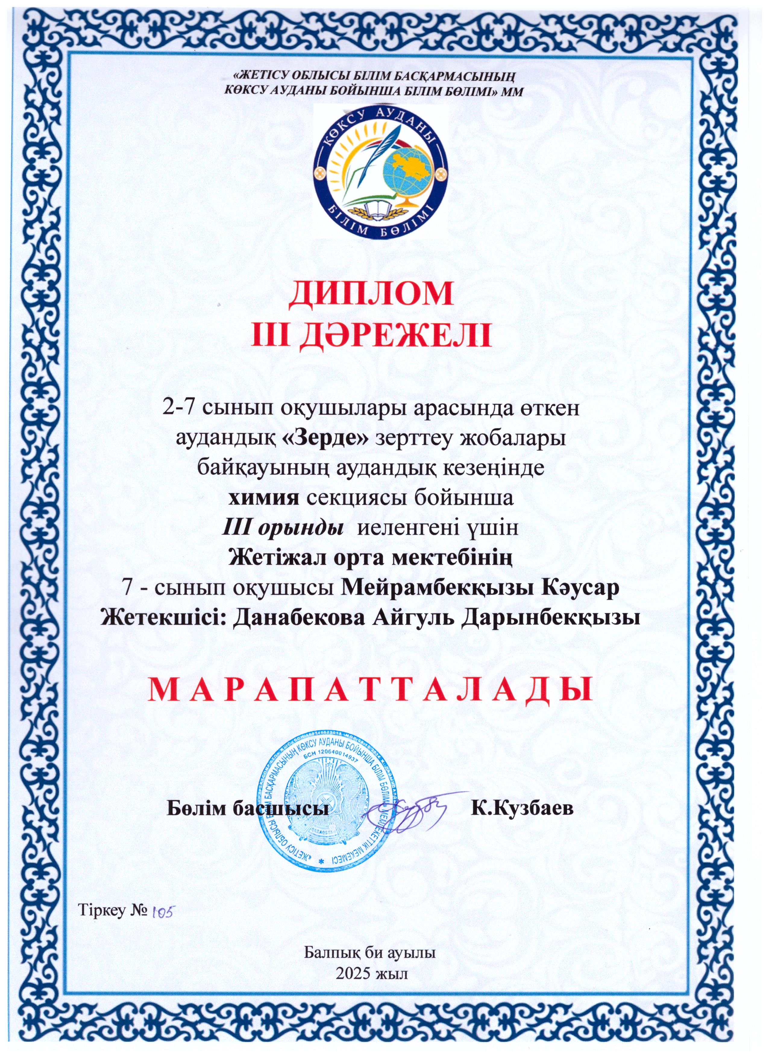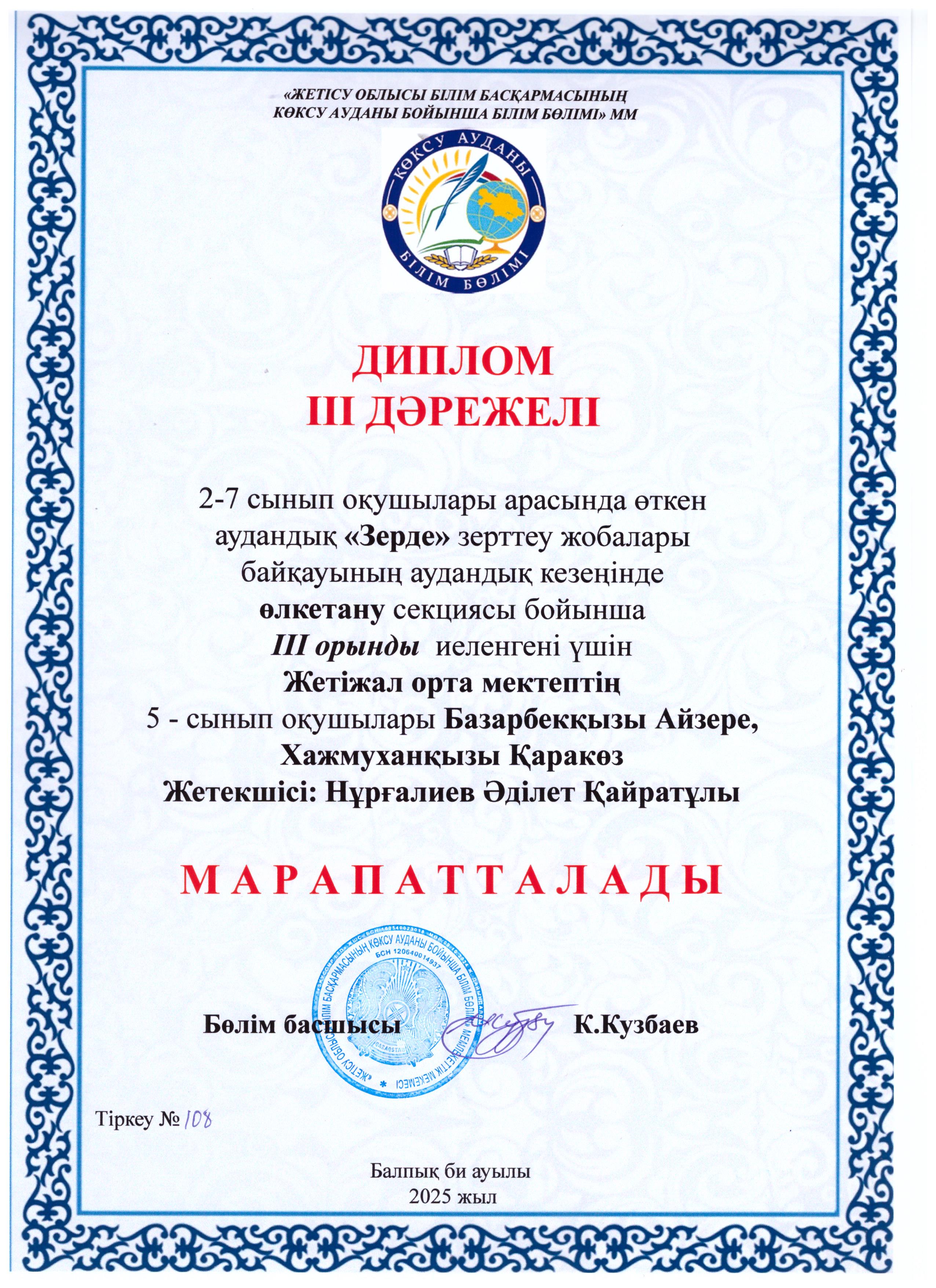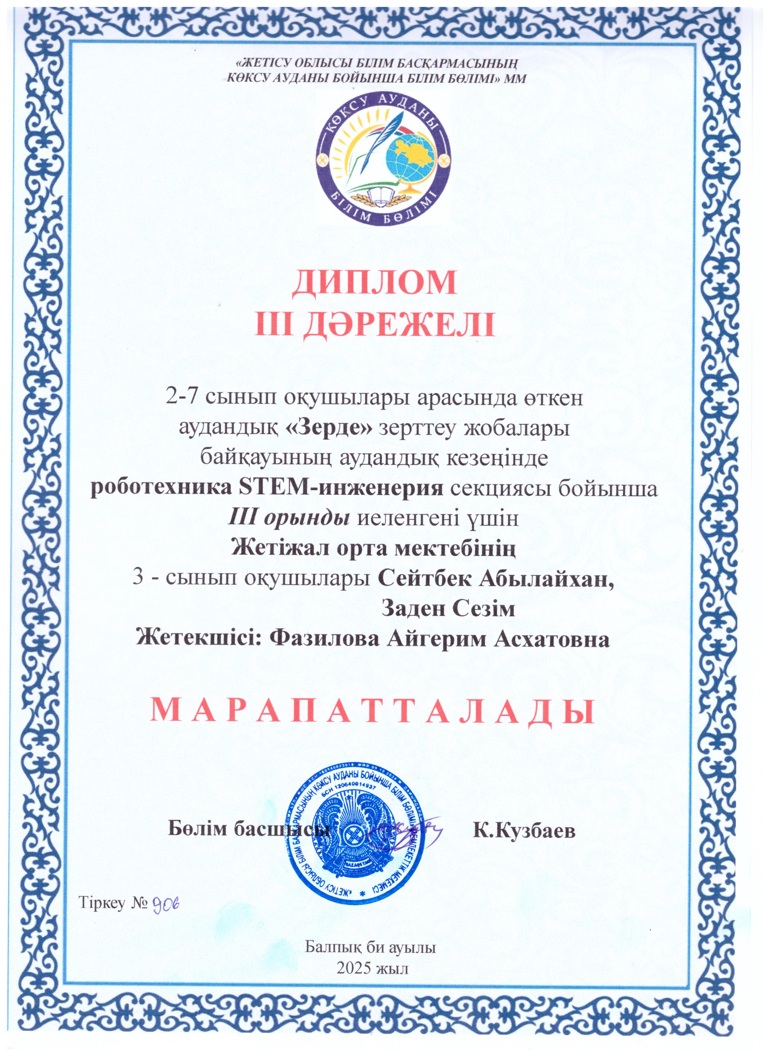 2–7 сынып оқушылары арасында өткен аудандық «Зерде» ғылыми-зерттеу жобалары байқауының аудандық кезеңінде информатика, өлкетану, технология және өнер, роботехника, экология, биология, физика, химиясекциялары бойынша жүлделі орындарға ие болған оқушыларымызды шын жүректен құттықтаймыз!