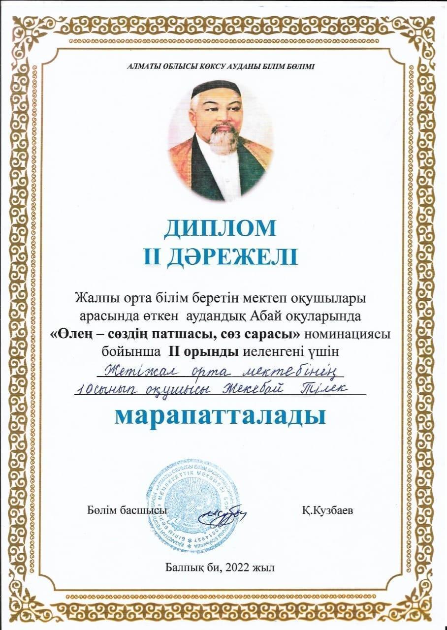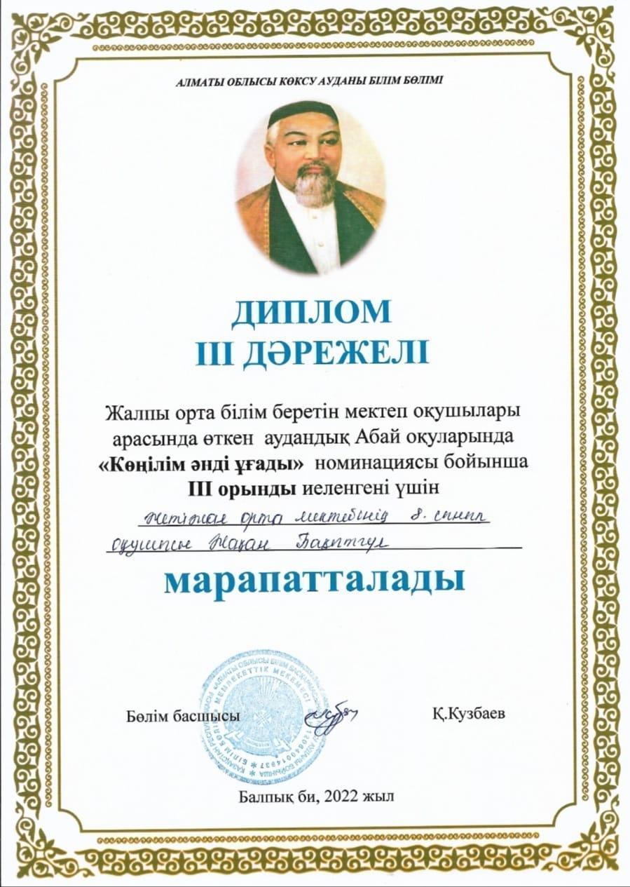 Жалпы орта білім беретін мектеп оқушылары арасында өткен аудандық Абай оқуларында "Өлең сөздің патшасы, сөз сарасы" номинациясы бойынша 10 сынып оқушысы Жекебай Тілек ІІ орын, "Абайдың қара сөздері" номинациясы бойынша 10 сынып оқушысы Қалел Айдана ІІ орын, "Абайдың ақын шәкірттері" номинациясы бойынша 10 сынып оқушысы Түйешібай Сания ІІ орын, "Көңілім әнді ұғады" номинациясы бойынша Жақан Бақытгүл ІІІ орынды иеленді.Оқушыларымызды шын жүректен жеңістерімен  құттықтаймыз!!!