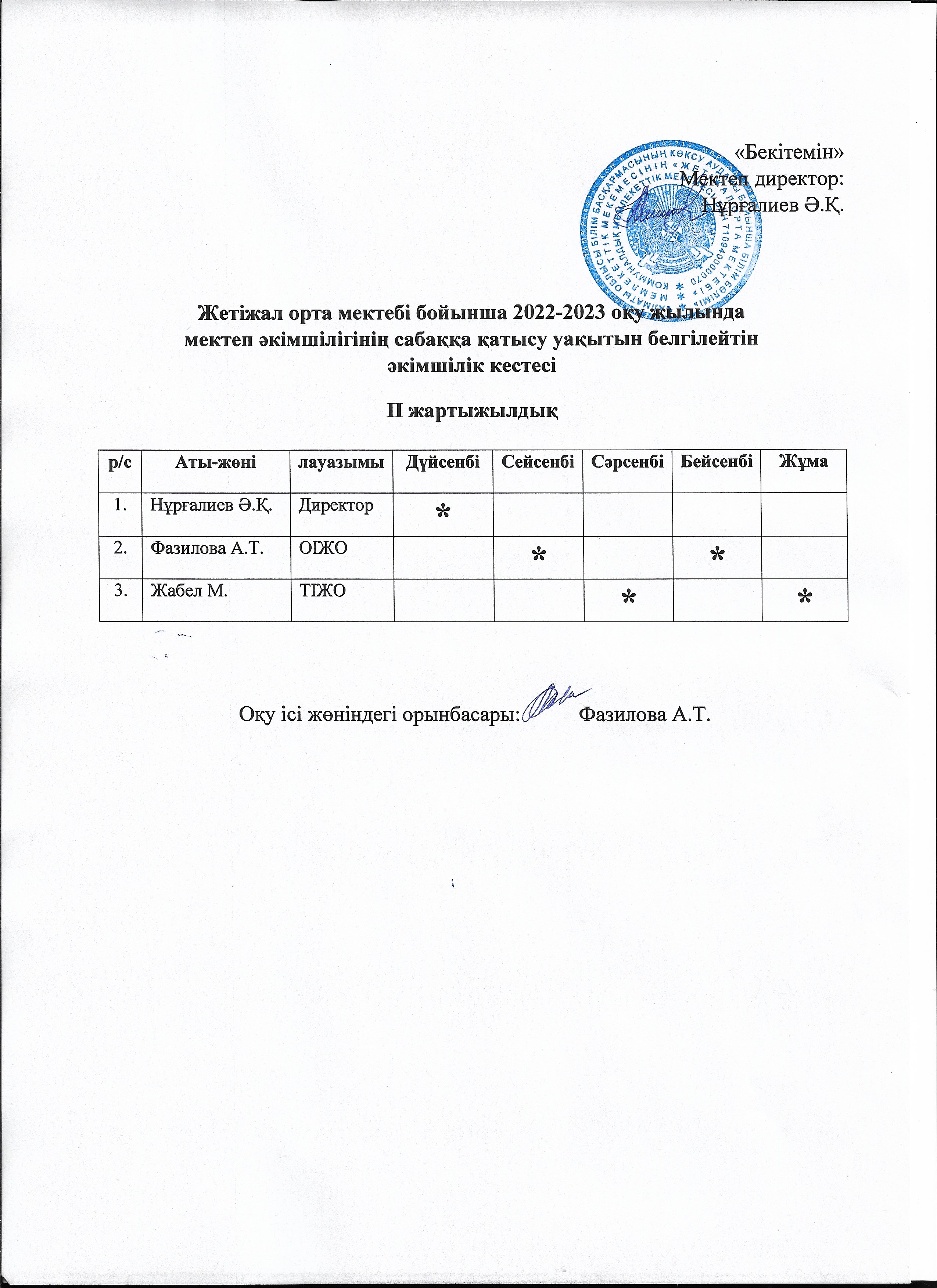 Мектеп әкімшілігінің сабаққа қатысу кестесі ІІ жартыжылдық » Көксу ауданы Жетіжал орта мектебі
