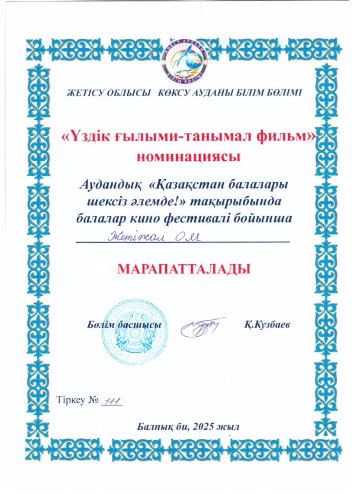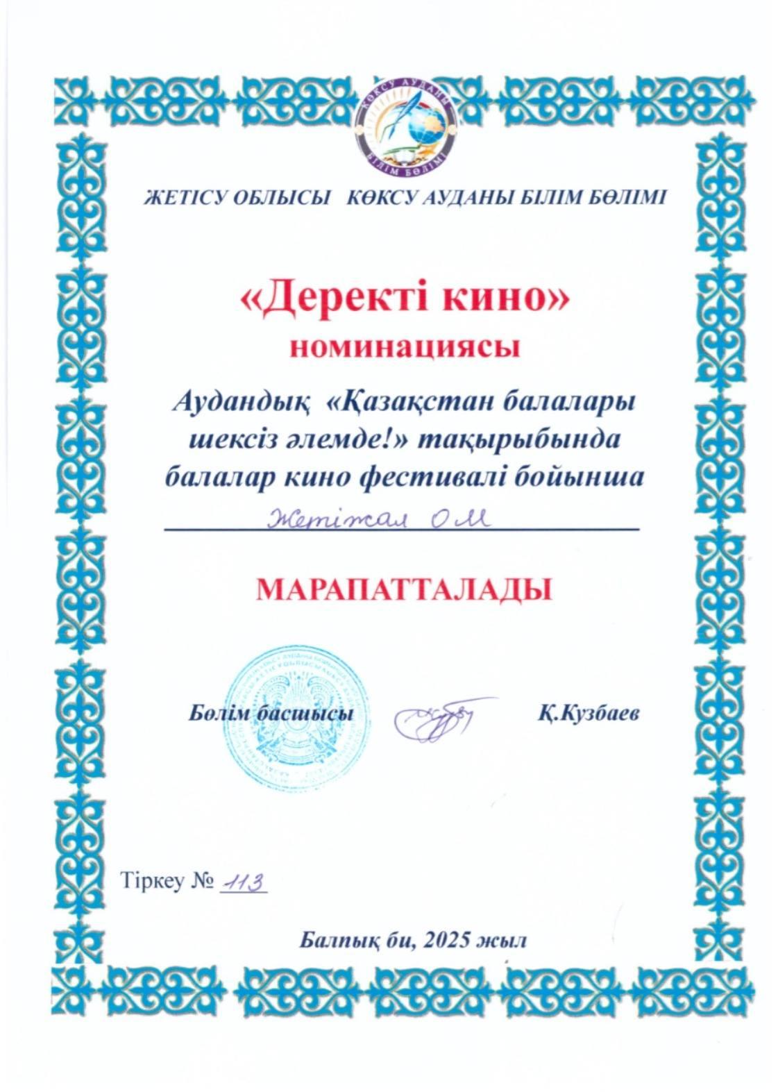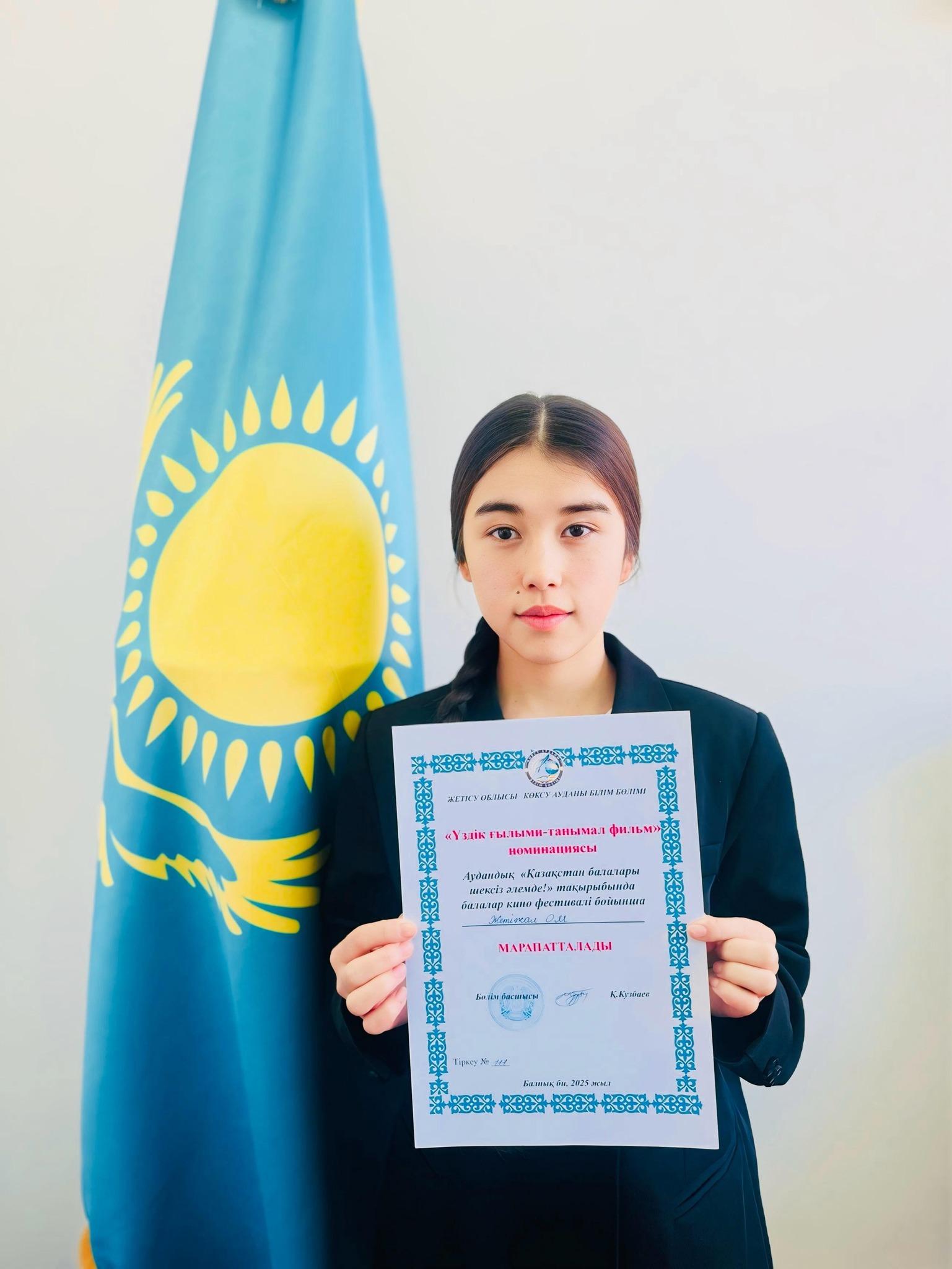 Аудандық "Қазақстан балалары шексіз әлемде!" тақырыбында балалар кино фестивалі бойынша "Деректі кино" номинациясына 9-сынып оқушысы Сейтбек Дильназ, "Үздік ғылыми-танымал фильм" номинациясы бойынша 11-сынып оқушысы Жақан Бақытгүл қатысып жеңімпаз атанды.Жетекшілері: Сағадиева Дамира Рустемқызы, Жабел Меруерт.