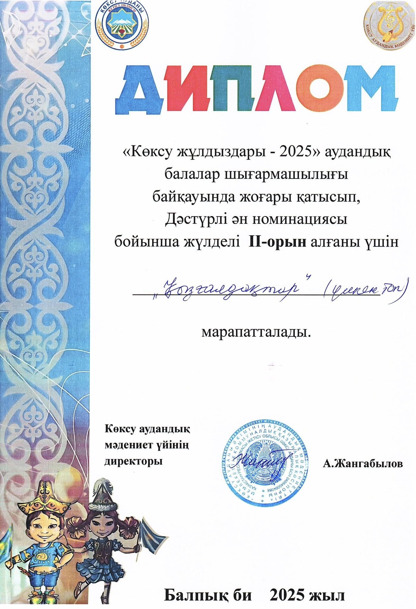 «Көксу жұлдыздары-2025”аудандық балалар шығармашылығы байқауында жоғары қатысып,Дәстүрлі ән номинациясы бойынша жүлделі ll-орын алғаны үшін “Ақшағала” тобы (кіші топ) және “Қызғалдақтар” тобы (үлкен топ)марапатталды.Шын жүректен құттықтаймыз!