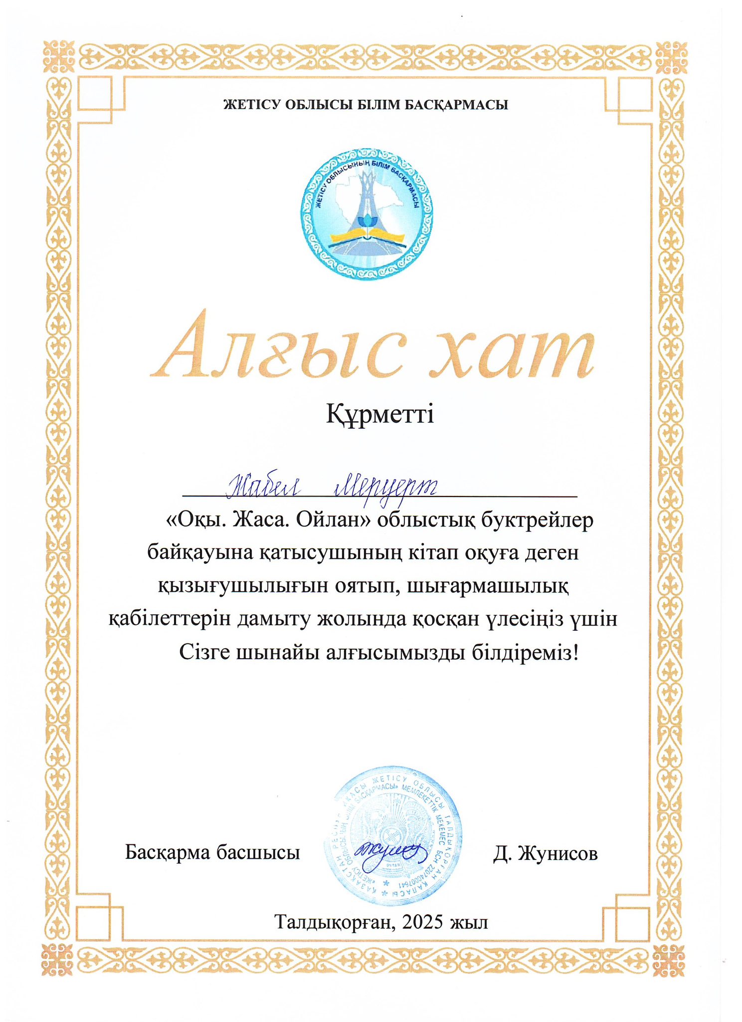 "Оқы. Жаса. Ойлан" облыстық буктрейлер байқауында оқушылардың қабілеттерін дамыту жолында қосқан еңбектері үшін мектебіміздің мұғалімдері басқарма басшысының Алғыс хатымен марапатталды.