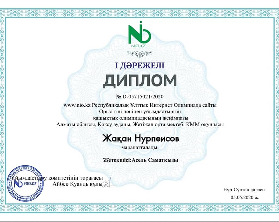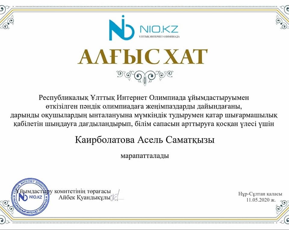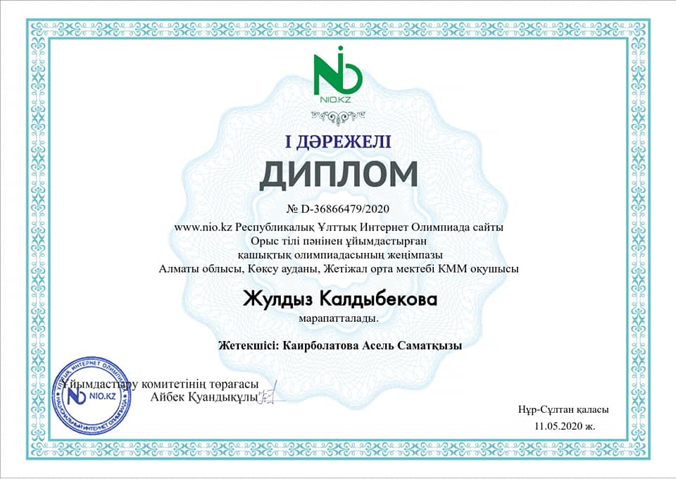Respýblıkalyq Ulttyq Internet Olımpıada ortalyǵy orys tіlі men ádebıetі pánіnen uıymdastyrǵan qashyqtyq olımpıadaǵa 5-8synyp oqýshylary qatysyp, júldelі I oryndarǵa ıe boldy.ShYN JÚREKTEN QUTTYQTAIMYZ!!!🥇🎉🎉🎉Pán muǵalіmі: Kaırbolatova A.S.