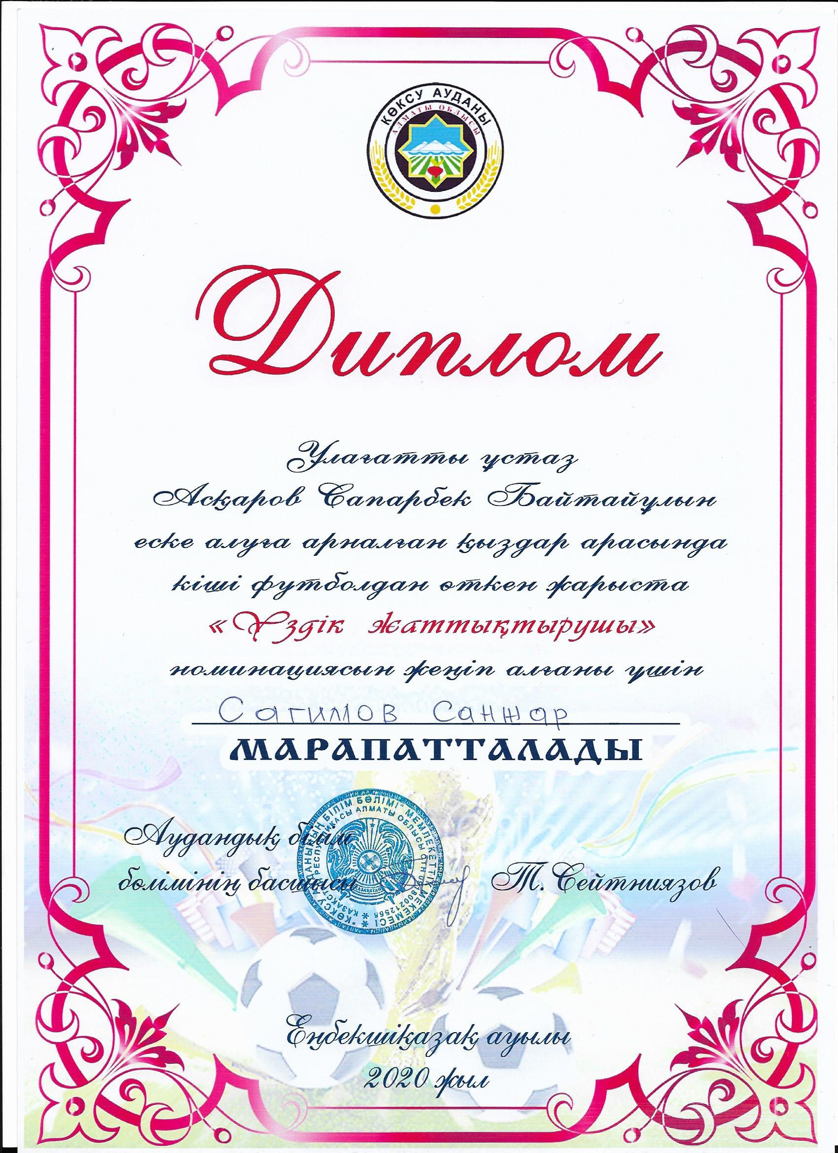 Ұлағатты ұстаз Асқаров Сапарбек Байтайұлын еске алуға арналған қыздар арасында кіші футболдан өткен жарыста оқушыларды жоғары деңгейде дайындағаны үшін "ҮЗДІК ЖАТТЫҚТЫРУШЫ"  номинациясын жеңіп алғаны үшін мектебіміздің денешынықтыру пәні мұғалімі С.Қ.Сагимов дипломмен марапатталды.Шын жүректен құттықтаймыз!!!