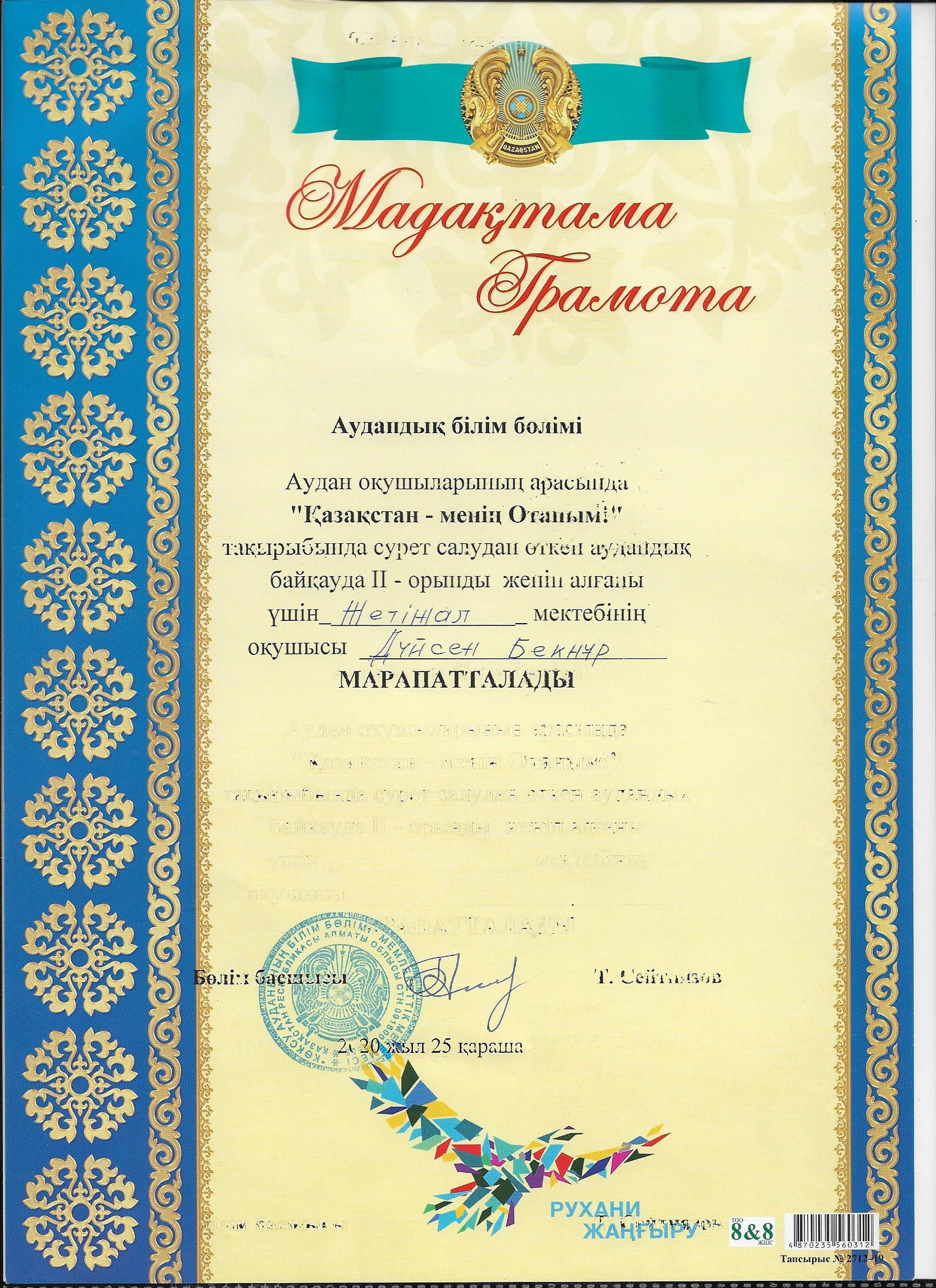 Kóksý aýdany oqýshylarynyń arasynda "Qazaqstan-menіń Otanym!" taqyrybynda sýret salýdan ótken aýdandyq baıqaýda mektıebіmіzdіń 6-synyp oqýshysy Dúısen Beknur júldelі II orynǵa ıe boldy. Shyn júrekten quttyqtaımyz!!! Jetekshіsі: Imantaeva S.T.