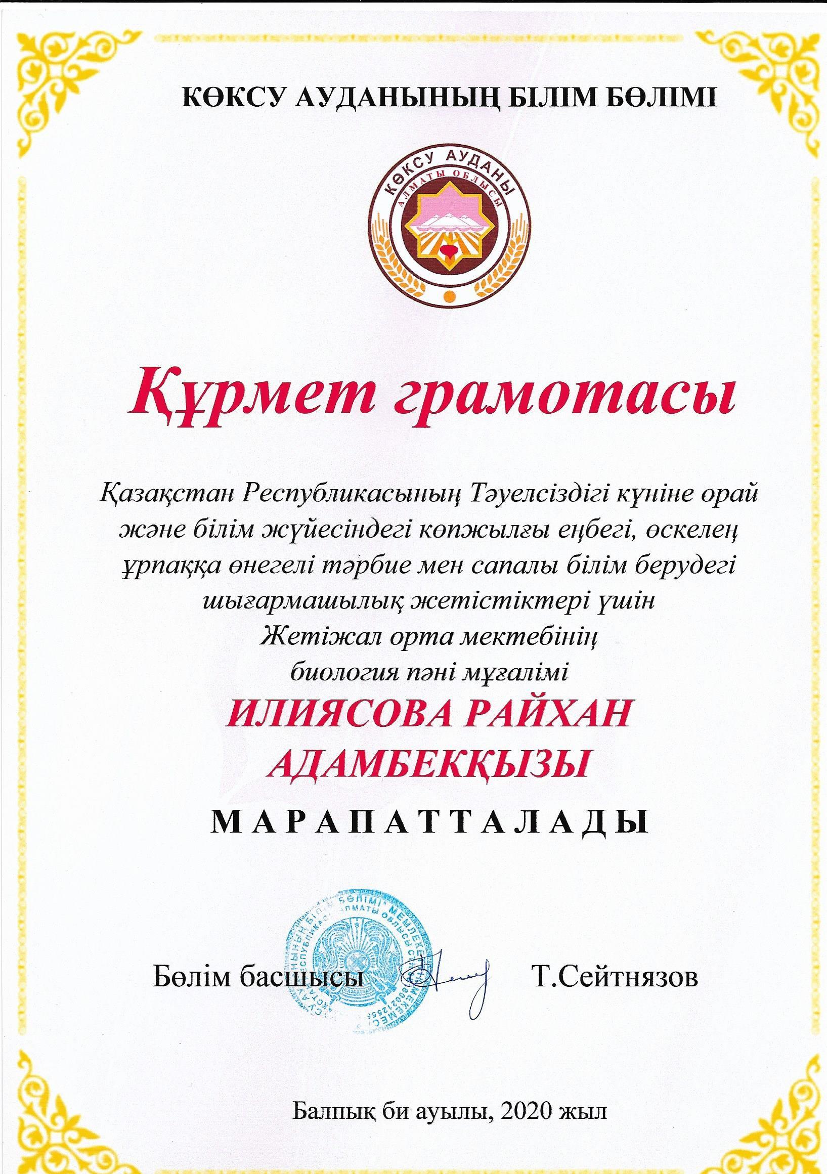 Qazaqstan Respýblıkasynyń Táýelsіzdіgі kúnіne oraı jáne bіlіm júıesіndegі kópjylǵy eńbegі, óskeleń urpaqqa ónegelі tárbıe men sapaly bіlіm berýdegі shyǵarmashylyq jetіstіkterі úshіn Jetіjal orta mektebіnіń bıologııa pánі muǵalіmі R.A.Ilııasova  Kóksý aýdany bіlіm bólіmі basshysynyń qurmet gramotasymen marpattaldy. QUTTYQTAIMYZ!!!