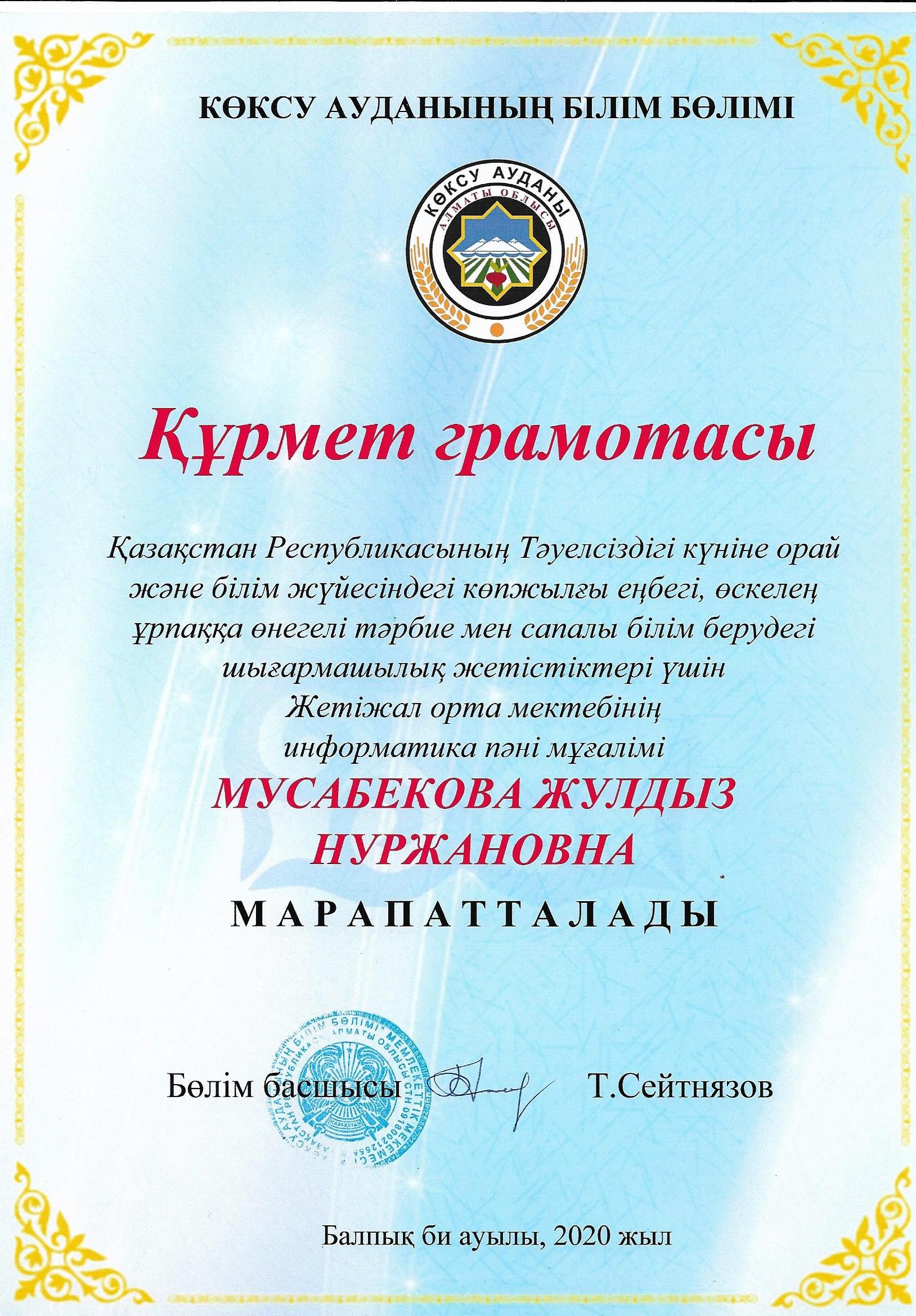 Qazaqstan Respýblıkasynyń Táýelsіzdіgі kúnіne oraı jáne bіlіm júıesіndegі kópjylǵy eńbegі, óskeleń urpaqqa ónegelі tárbıe men sapaly bіlіm berýdegі shyǵarmashylyq jetіstіkterі úshіn Jetіjal orta mektebіnіń ınformatıka pánі muǵalіmі J.N.Mýsabekova  Kóksý aýdany bіlіm bólіmі basshysynyń qurmet gramotasymen marpattaldy. QUTTYQTAIMYZ!!!