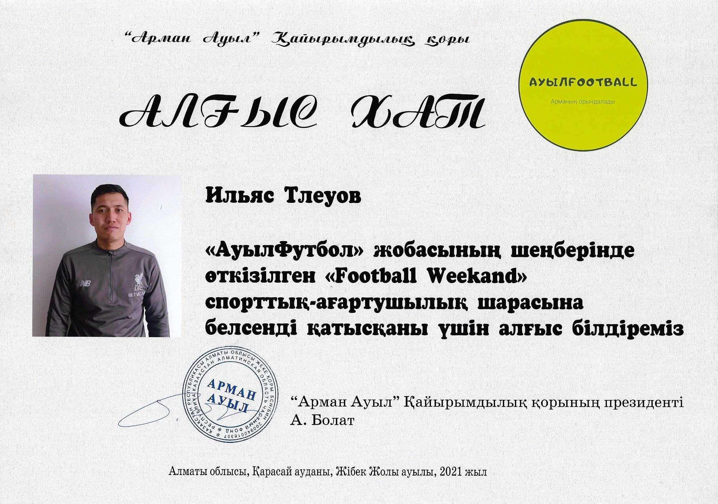 "АуылФутбол" жобасының шеңберінде өткізілген "Football Weekand" спорттық-ағартушылық шарасына Жетіжал орта мектебінің 4-5 сынып оқушыларын дайындап, белсенділік танытқаны үшін мектебіміздің денешынықтыру пәні мұғалімі  И.К.Тлеуов алғыс хатпен марапатталды. Құтты болсын!!!