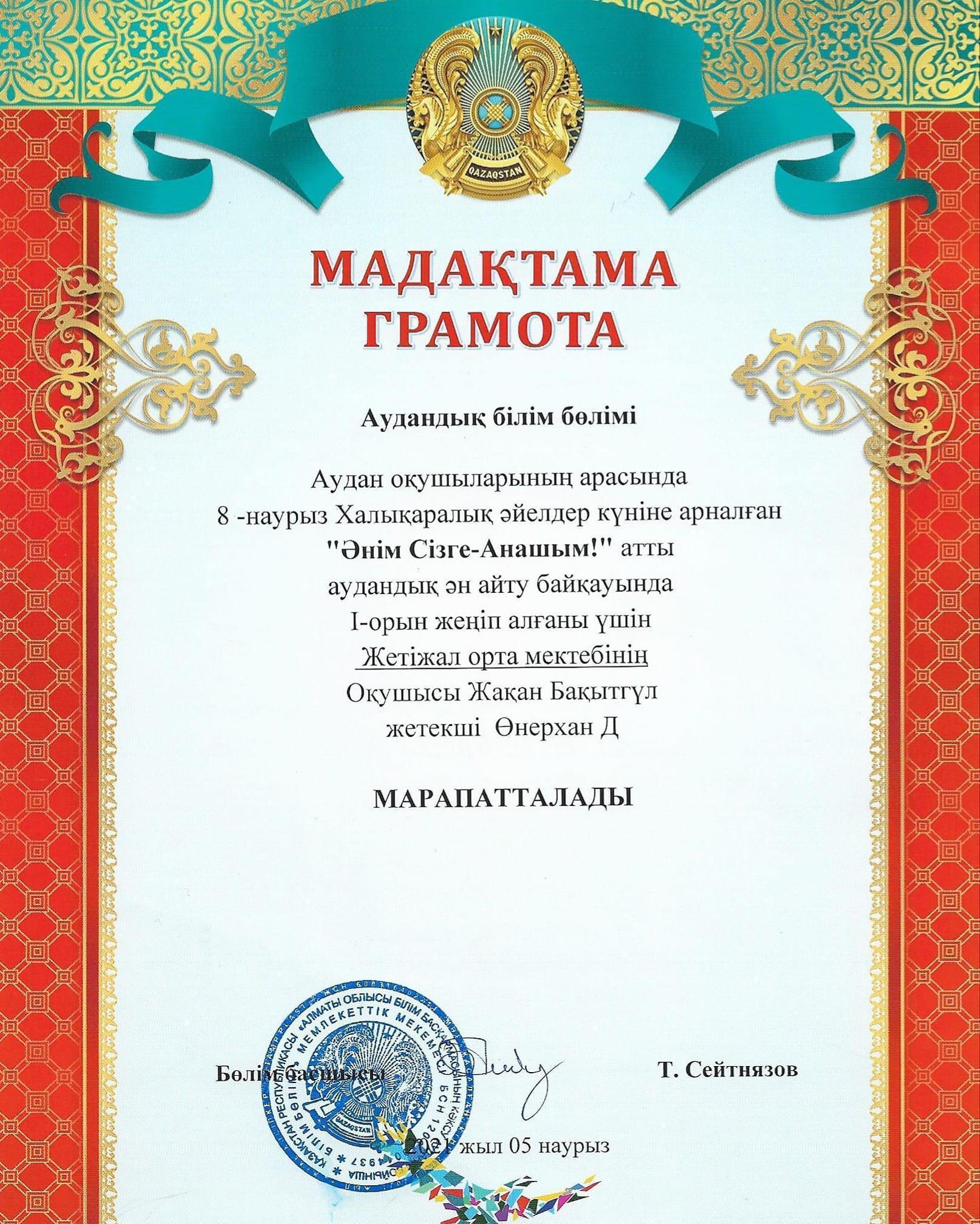 Аудан оқушылары арасында өткен 8-наурыз халықаралық әйелдер күні мерекесіне орай "Әнім Сізге - Анашым!" атты аудандық ән айту байқауында мектебімізлің 7-сынып оқушысы Жақан Бақытгүл жүлделі І орынға ие болды!!!Шын жүректен құттықтаймыз!!!Жетекшісі:Өмірқан Д.