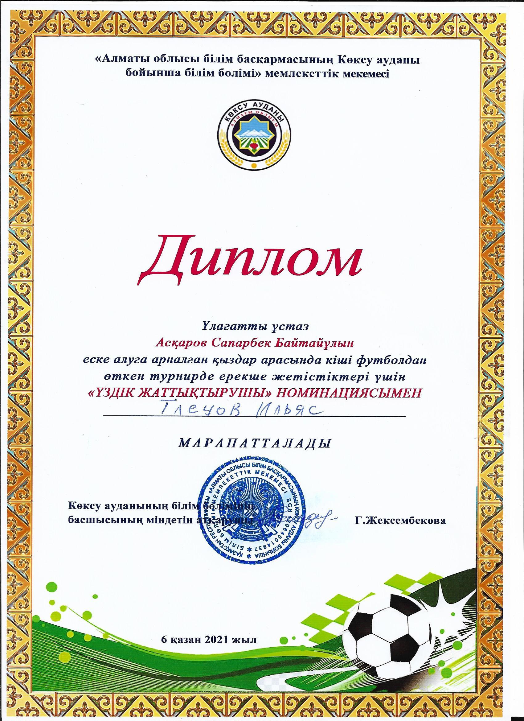 Ұлағатты ұстаз Асқаров Сапарбек Байтайұлын еске алуға арналған қыздар арасында кіші футболдан өткен турнирде "Үздік жаттықтырушы" номинациясымен Жетіжал орта мектебінің дене шынықтыру пәні мұғалімі Тлеуов Ильяс Какимович марапатталды. Шын жүректен құттықтаймыз!!!